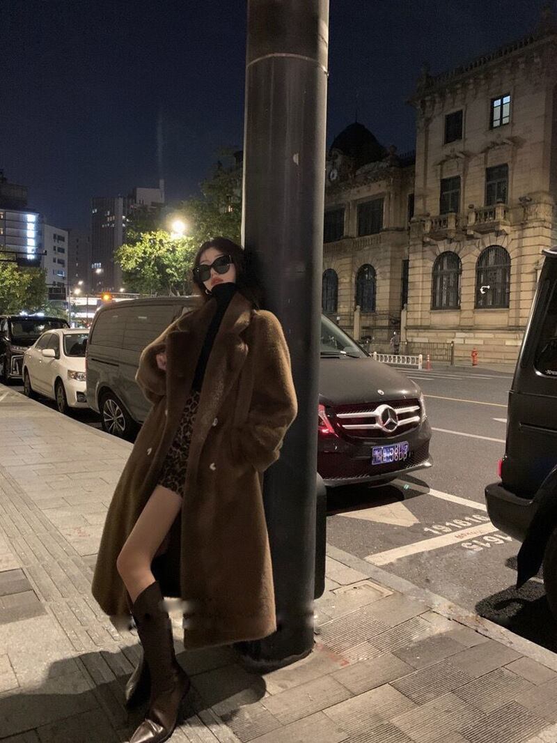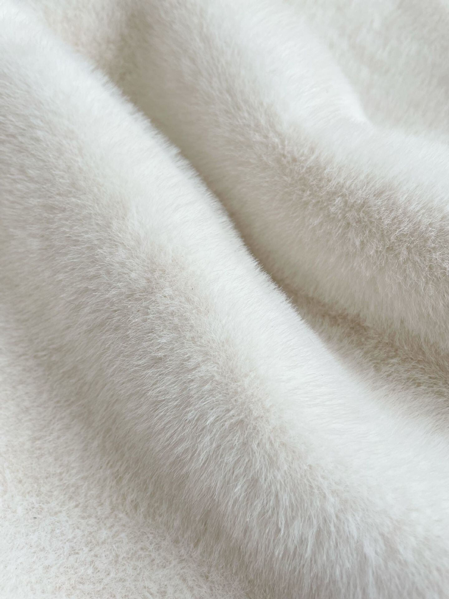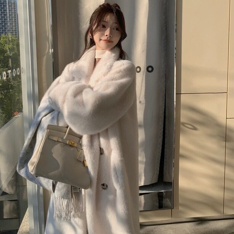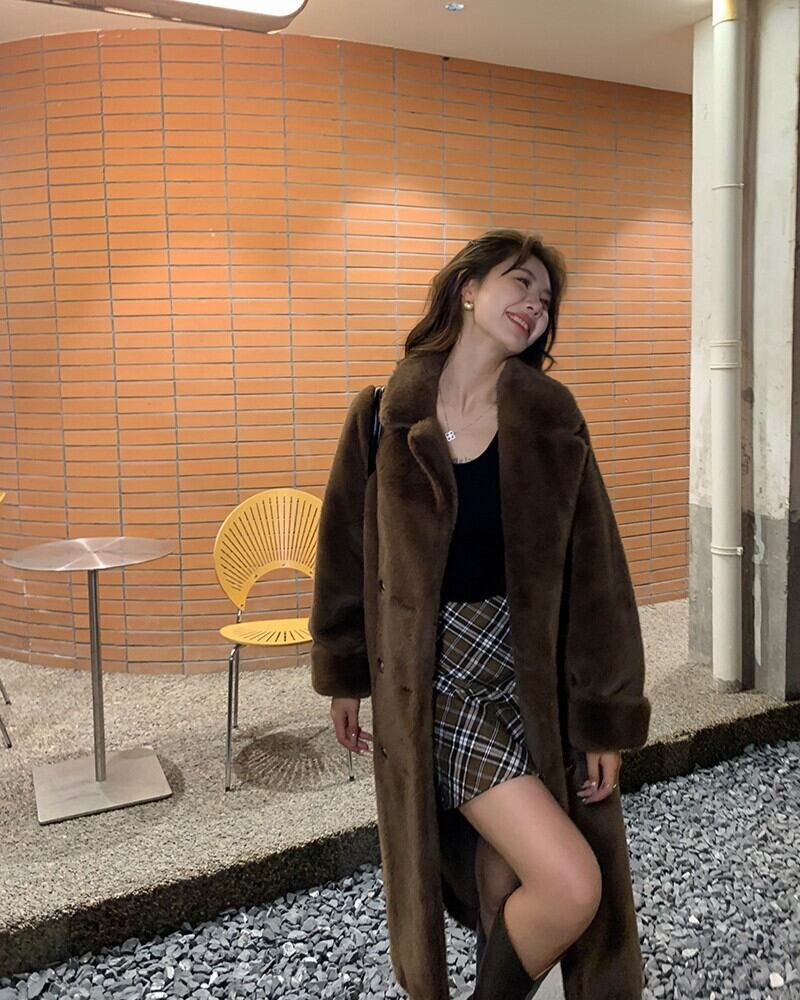 ふわふわのフェイクファーがもこもこ可愛いらしさを引き立てる、エレガントなロングコート。