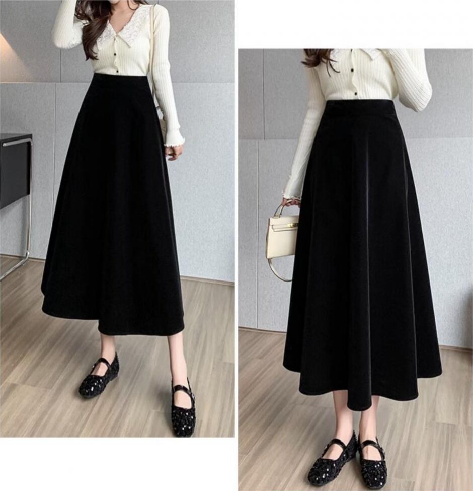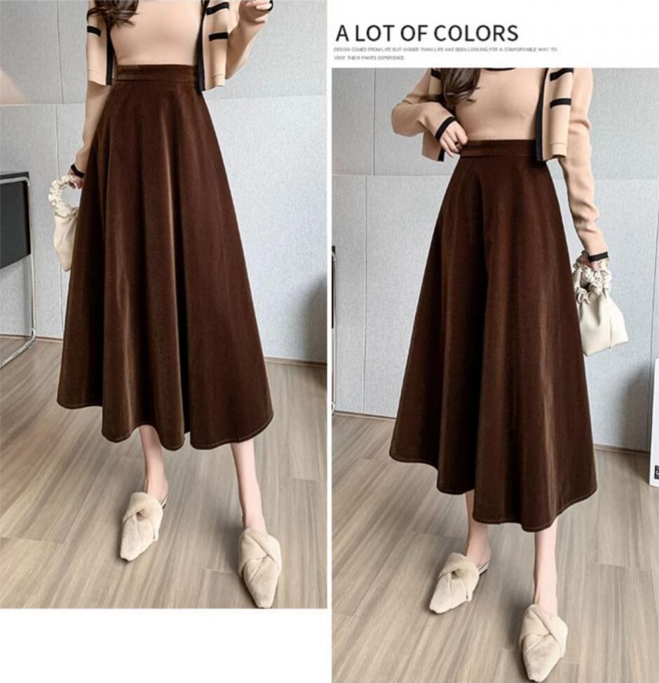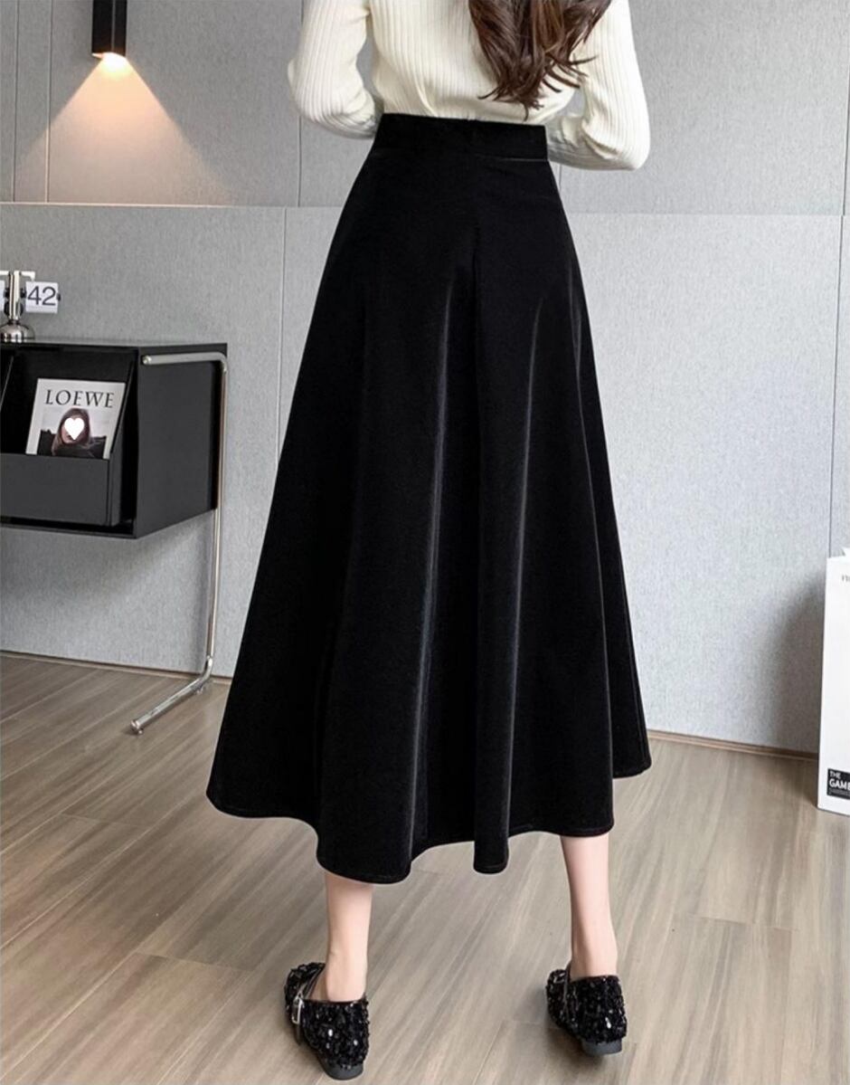 レディース スカート ボトムス フレアスカート ロングスカート ミモレ ロング フレア Aライン フェミニン ハイウエスト ベルベット かわいい 大人可愛い きれいめ シンプル 上品 おしゃれ レトロ エレガント ラグジュアリー クラシカル ベーシック ロマンティック 清潔感 シック 無地 秋冬 お出かけ ランチ お呼ばれ オケージョン 体型カバー 脚長 普段使い 着回し 清楚 スタイルアップ M L XL 2XL 3XL 大きいサイズ プラスサイズ ぽっちゃり 黒 ブラック 茶色 ブラウン