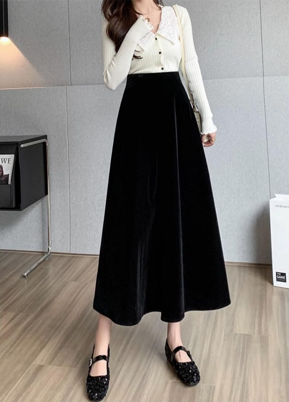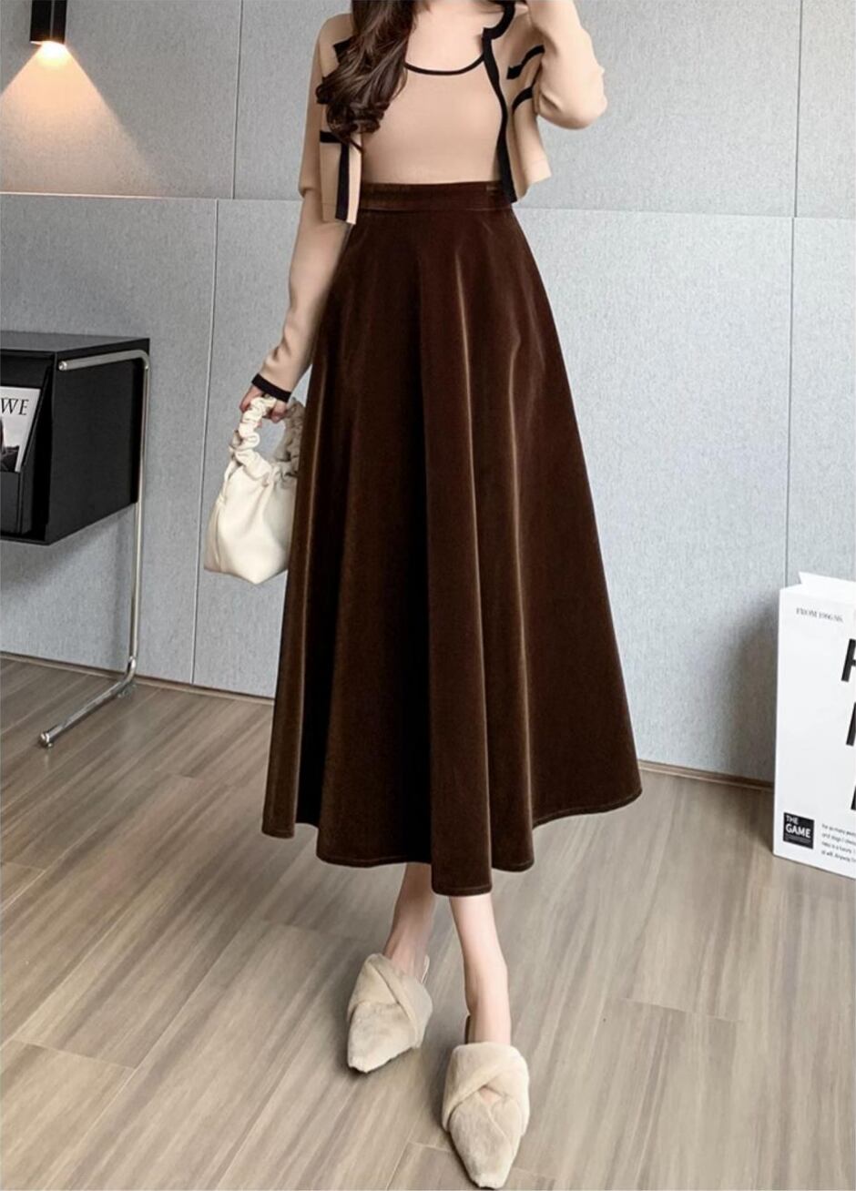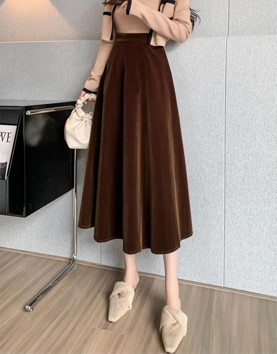レディース スカート ボトムス フレアスカート ロングスカート ミモレ ロング フレア Aライン フェミニン ハイウエスト ベルベット かわいい 大人可愛い きれいめ シンプル 上品 おしゃれ レトロ エレガント ラグジュアリー クラシカル ベーシック ロマンティック 清潔感 シック 無地 秋冬 お出かけ ランチ お呼ばれ オケージョン 体型カバー 脚長 普段使い 着回し 清楚 スタイルアップ M L XL 2XL 3XL 大きいサイズ プラスサイズ ぽっちゃり 黒 ブラック 茶色 ブラウン