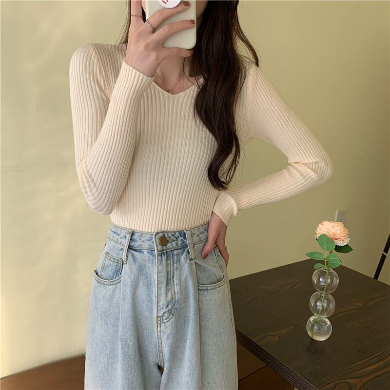 すっきりとしたVネックがデコルテを美しく見せる、シンプルで上品なリブニットトップス。