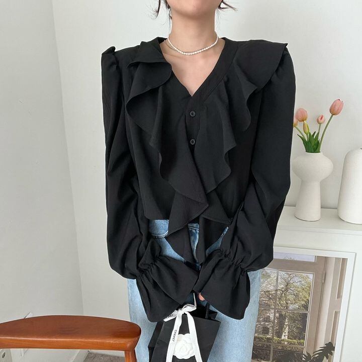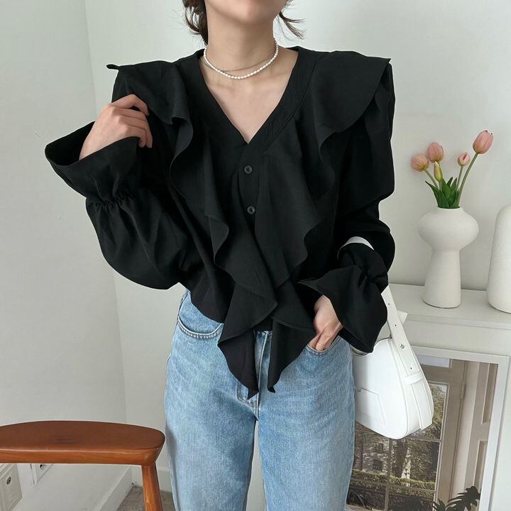 フリル×前開きボタンのディテールがガーリーさをプラスしつつ、大人っぽい上品さも演出。