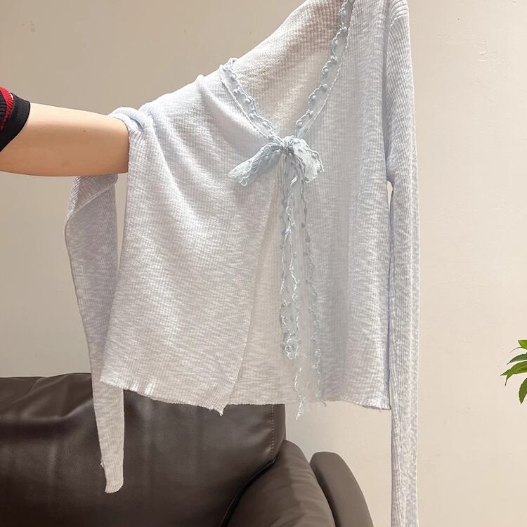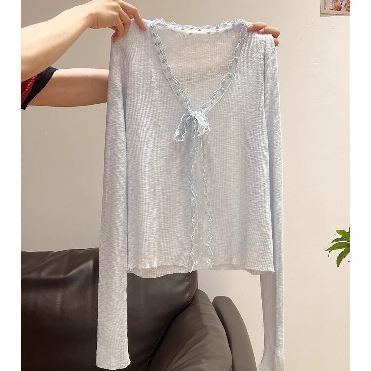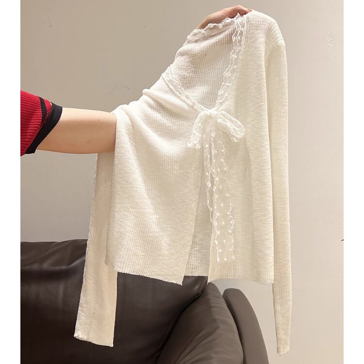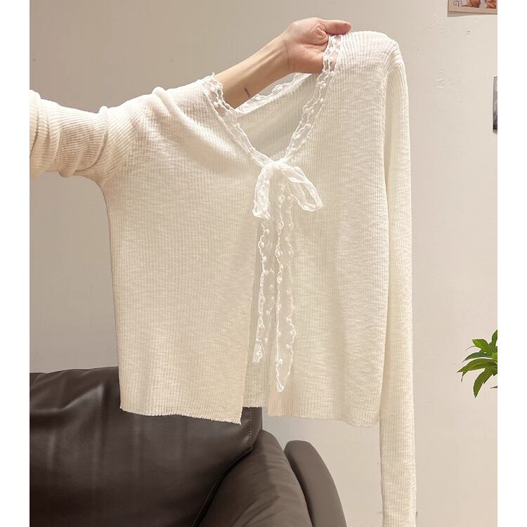 レディース トップス カーディガン サマーニット 羽織 前開き クロップド丈 長袖 Vネック スリム 細身 フェミニン レース リボン リブニット 透け感 かわいい 大人可愛い 上品 おしゃれ こなれ感 ガーリー エレガント 存在感 キュート ロマンティック ナチュラル 無地 ドット柄 春 夏 ママ OL 学生 デート お出かけ 旅行 女子会 休日 ショッピング カフェ ランチ お呼ばれ 重ね着 コーデ 普段使い 着回し レイヤード モテ 清楚 ワンサイズ 白 ホワイト ブルー 大人カラー パープル