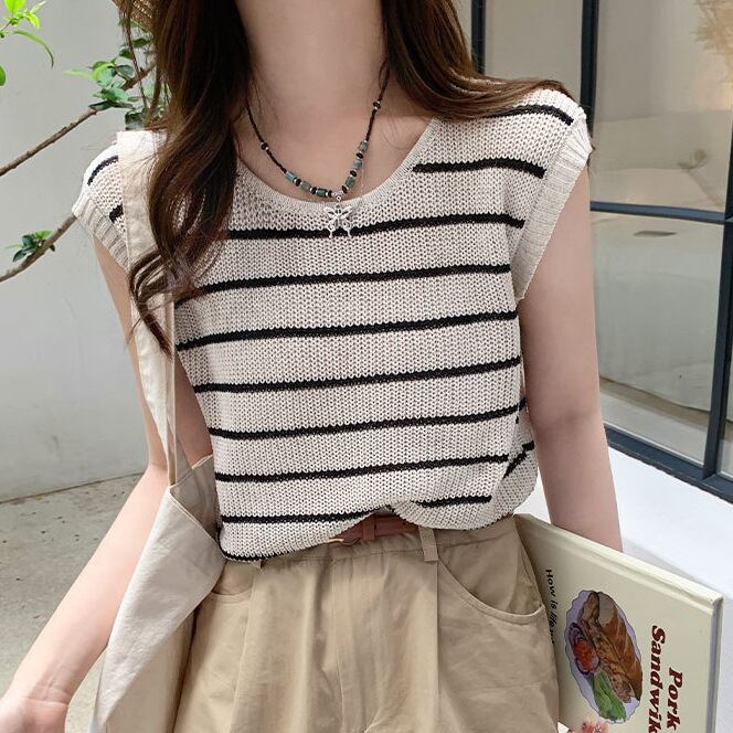 レディース トップス ニット サマーセーター ベスト フレンチスリーブ ラウンドネック 襟なし ノーカラー かわいい 大人可愛い シンプル カジュアル 上品 おしゃれ こなれ感 ラフ 存在感 抜け感 キュート クラシカル ベーシック 涼しげ 軽やか 無地 ボーダー 夏 OL 学生 デート お出かけ 旅行 公園 女子会 休日 ガーデン ショッピング コンサート カフェ ランチ コーデ 普段使い 着回し 清楚 ワンサイズ ベージュ ピンク ベーシックカラー 大人カラー ブラックストライプ ベージュストライプ