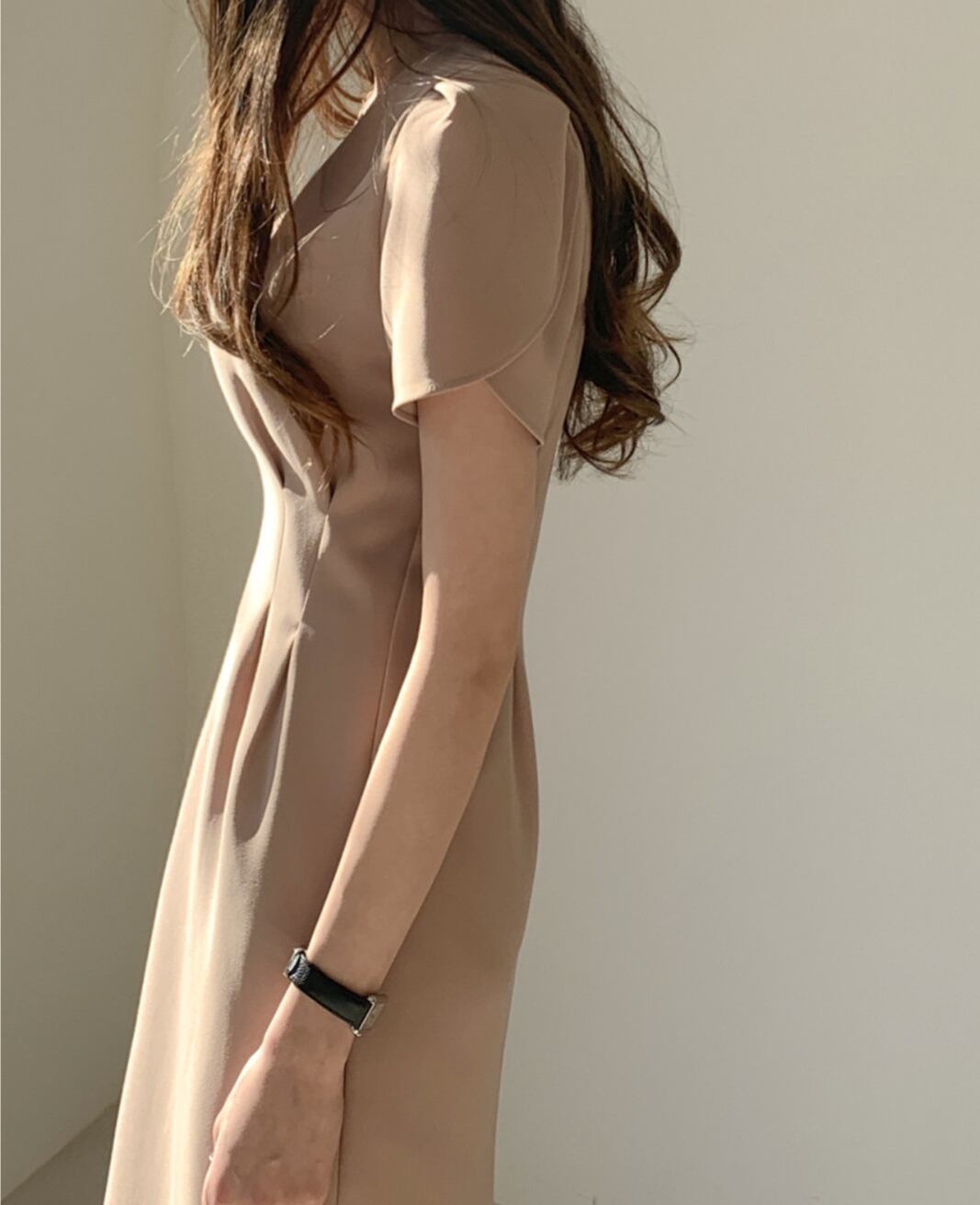 Vネックデザインで首元をすっきりと見せ、シンプルながらも存在感のある大人の女性にぴったりな上品なミモレ丈ワンピースです。