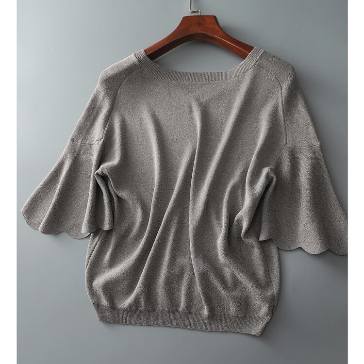 Vネック×スカラップエッジが女性らしいデコルテラインを演出し、上品かつ大人可愛い印象に仕上げます。ベルスリーブ風のボリューム袖とドロップショルダーで、こなれ感と華やかさをプラス。