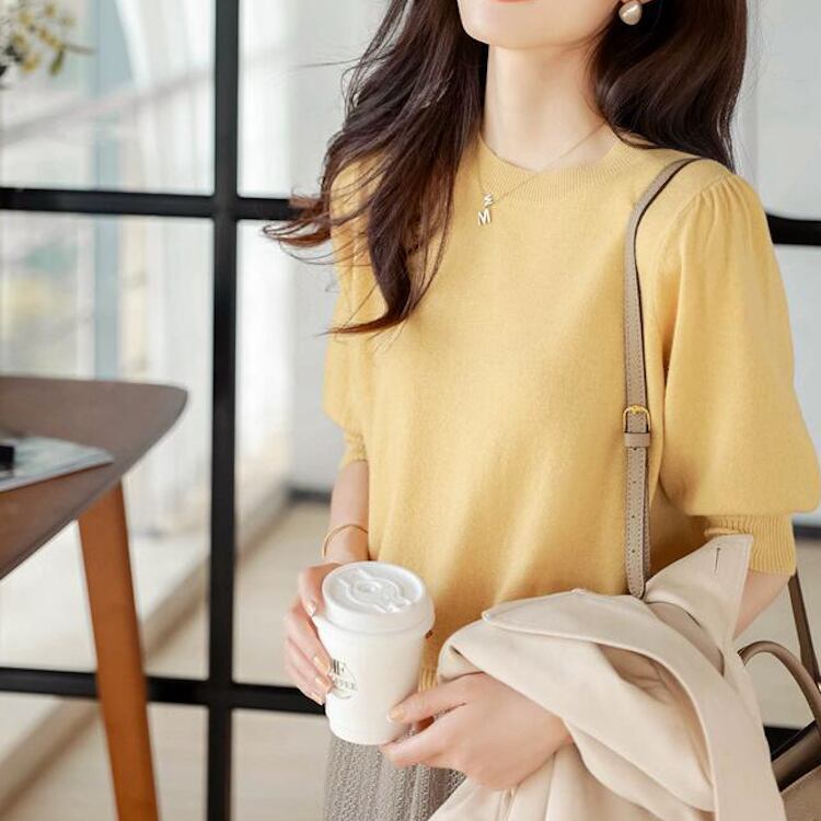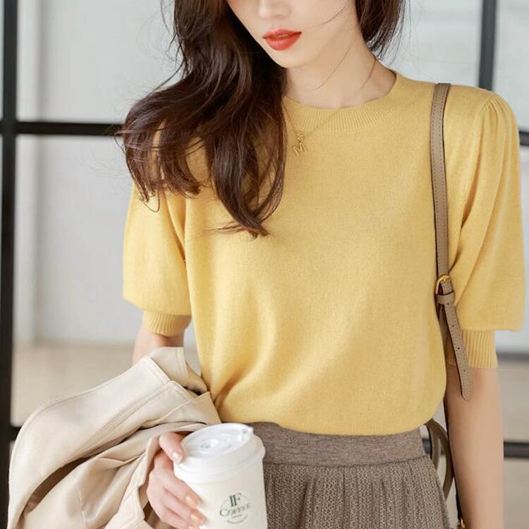 レディース トップス ニット 半袖 ボリューム袖 ラウンドネック 襟なし ノーカラー フェミニン ボタン かわいい 大人可愛い シンプル 上品 おしゃれ こなれ感 存在感 キュート クラシカル ベーシック ナチュラル 清潔感 無地 春 夏 ママ オフィス OL 通勤 学生 デート お出かけ 旅行 レストラン 女子会 休日 ショッピング 発表会 コンサート 合コン コンパ カフェ 婚活 ランチ お呼ばれ コーデ 普段使い 着回し モテ 清楚 定番 ワンサイズ 黄色 イエロー ピンク 水色 ブルー キャメル