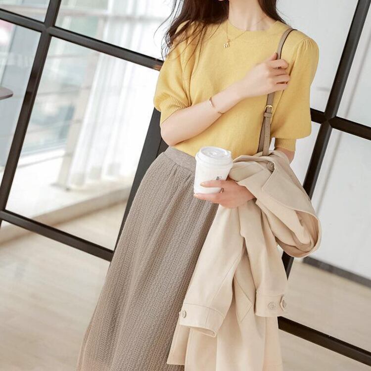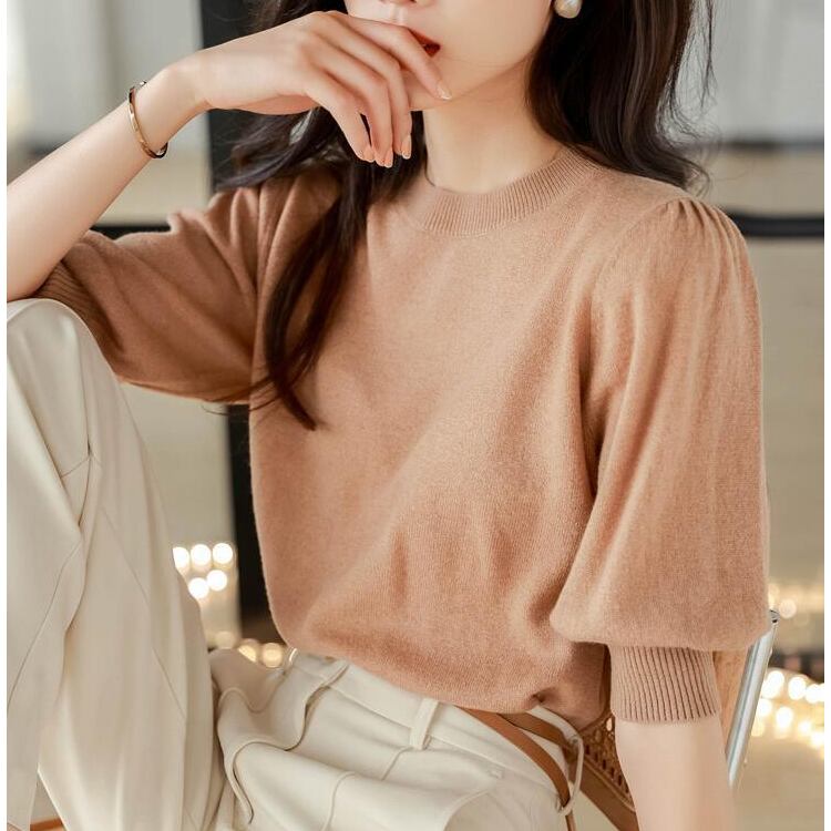 上品さと可愛らしさを兼ね備えた半袖ニットトップス。