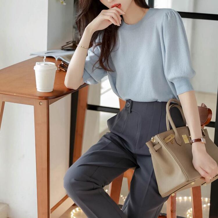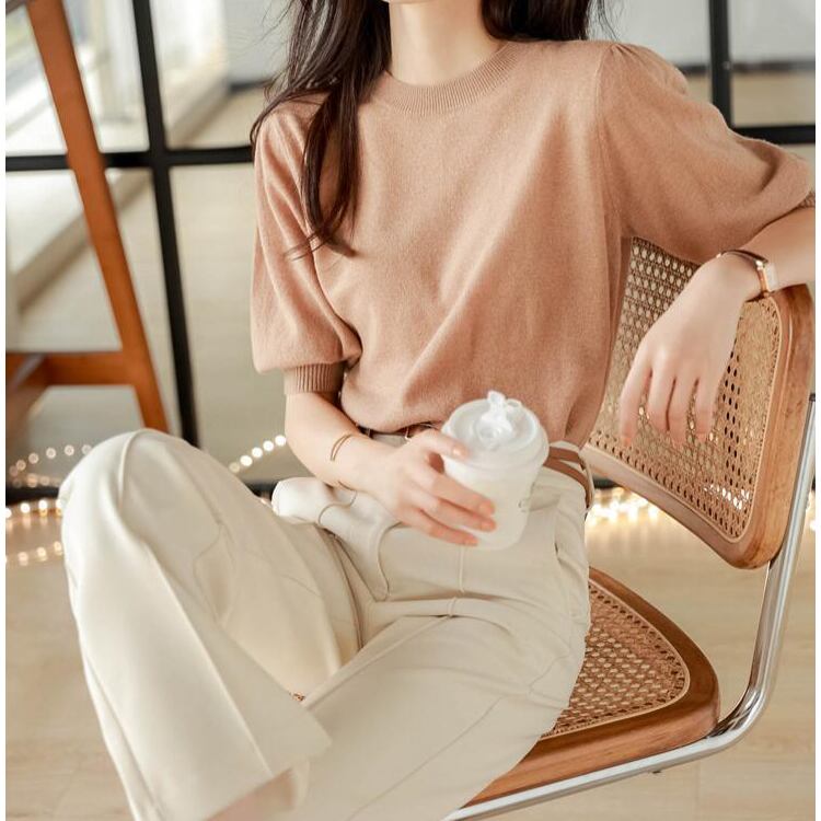 ラウンドネック×ボリューム袖が柔らかなシルエットを生み出し、フェミニンで大人可愛い印象に仕上がります。