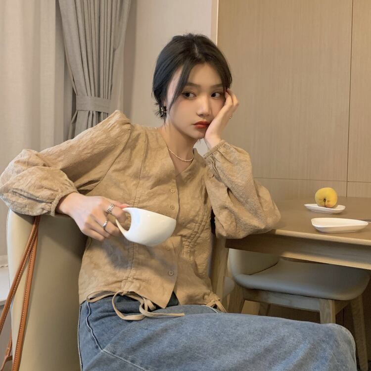 レディース トップス ブラウス 前開き 長袖 ボリューム袖 パフスリーブ Vネック 襟なし ノーカラー フェミニン リボン ボタン シャーリング かわいい 大人可愛い カジュアル 上品 おしゃれ こなれ感 ガーリー 存在感 キュート ロマンティック ナチュラル 春 秋 デート お出かけ 旅行 公園 女子会 休日 ショッピング 発表会 コンサート 合コン コンパ カフェ ランチ お呼ばれ コーデ 普段使い 着回し モテ 清楚 S M L XL 白 ホワイト カーキ くすみ ベーシックカラー 大人カラー