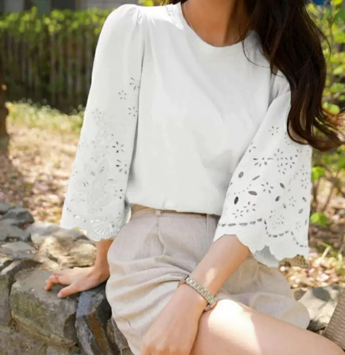 トップス シャツ ブラウス カットソー プルオーバー レディース 7分袖 フレアスリーブ ラウンドネック フェミニン レース 切り替えデザイン ドッキング 異素材ミックス きれいめ シンプル カジュアル 上品 おしゃれ こなれ感 ラフ 個性的 モード系 存在感 春 夏 秋 オフィス OL 通勤 デート お出かけ イベント 女子会 休日 ショッピング カフェ ランチ 韓国 オルチャン コーデ 楽ちん 体型カバー 普段使い 着回し 清楚 トレンド スタイルアップ フリーサイズ ワンサイズ ホワイト ブラック