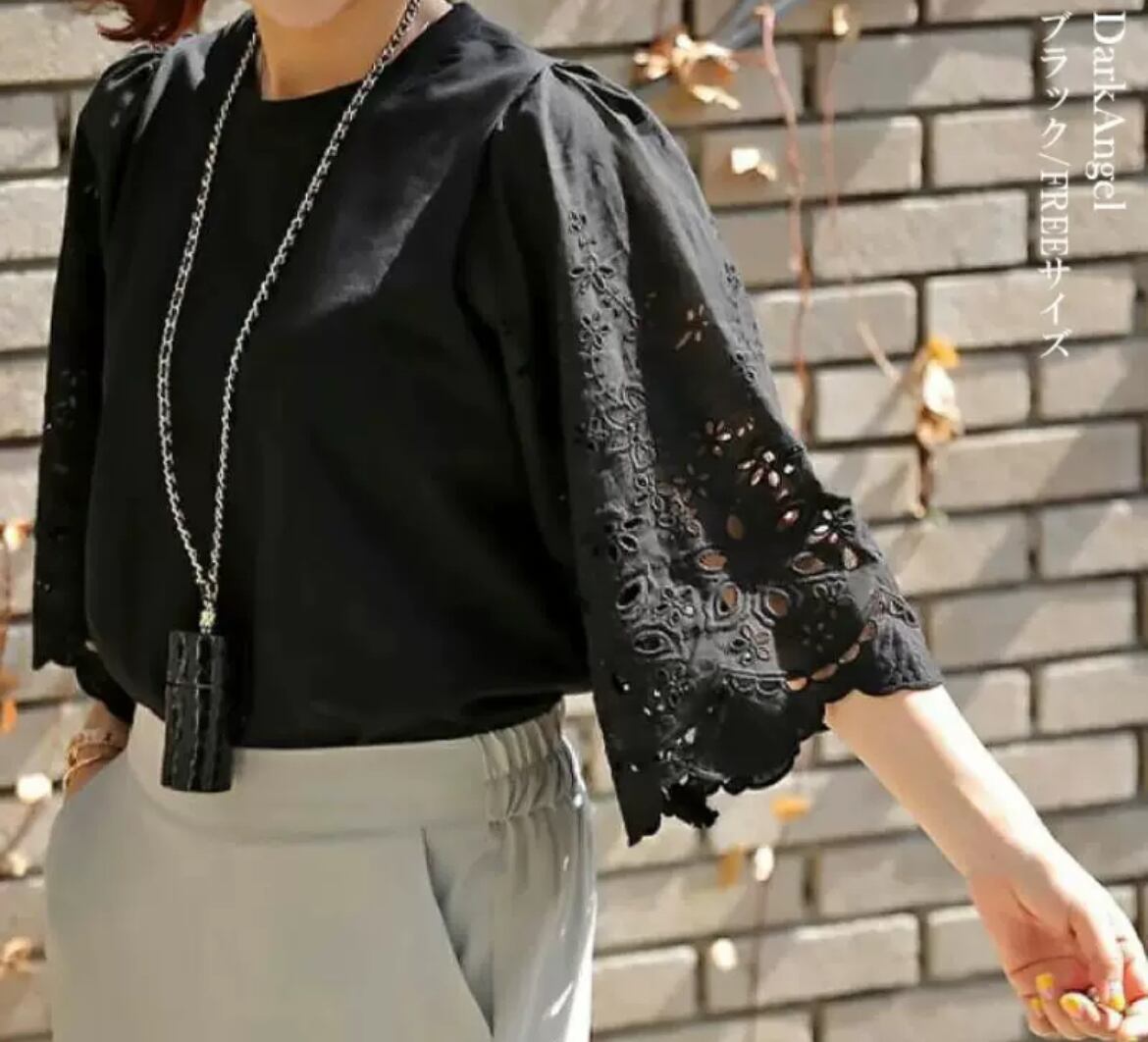 フレアスリーブと切り替えデザインが特徴的で、異素材ミックスが個性を引き立てます。