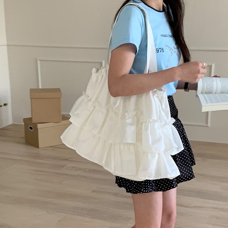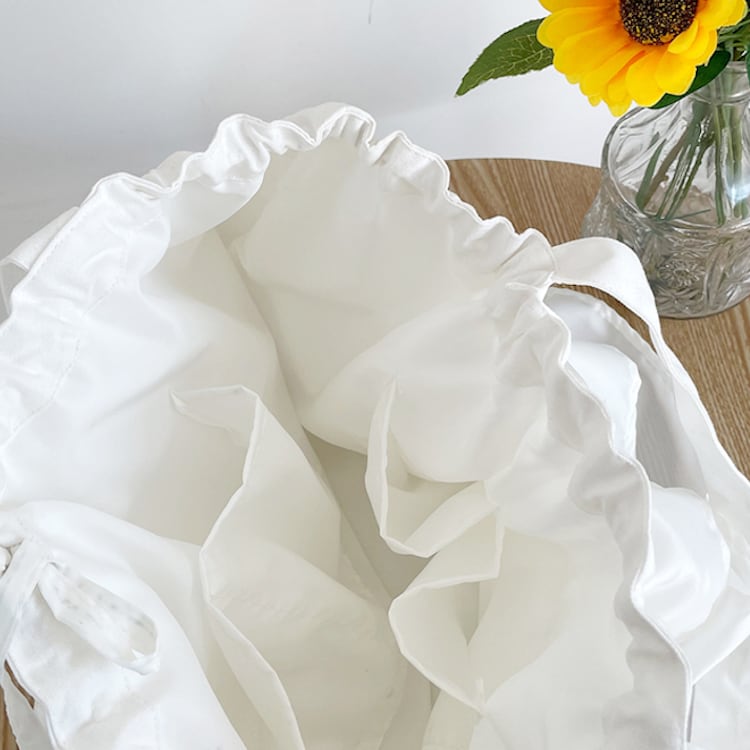 フリルとティアードデザインが華やかさを演出する、巾着型トートバッグ。