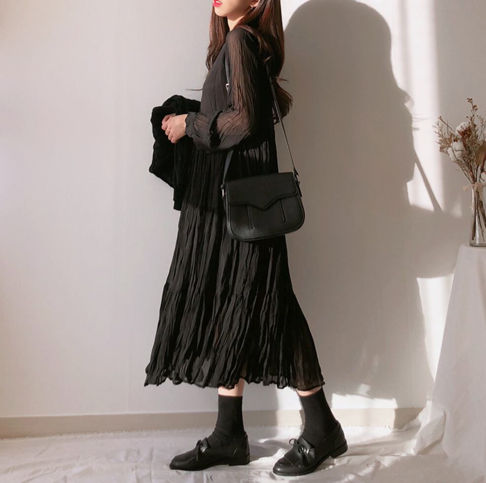 大人可愛い雰囲気を演出する、ロング袖のミモレ丈ワンピースです。挿し色として活躍する透け感のある素材を使用しており、エレガントなフリルやプリーツデザインが女性らしい印象を与えます。デートやお出かけ、女子会、さらにはカフェでのランチにも最適です。