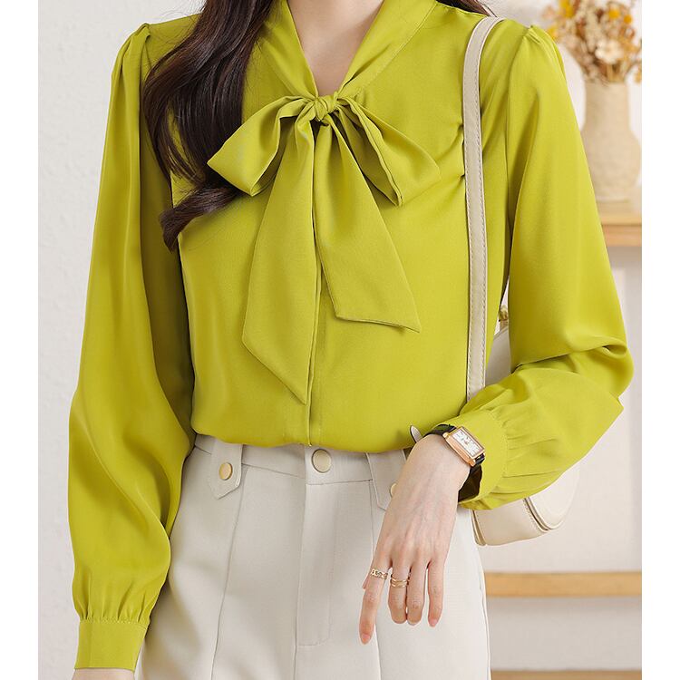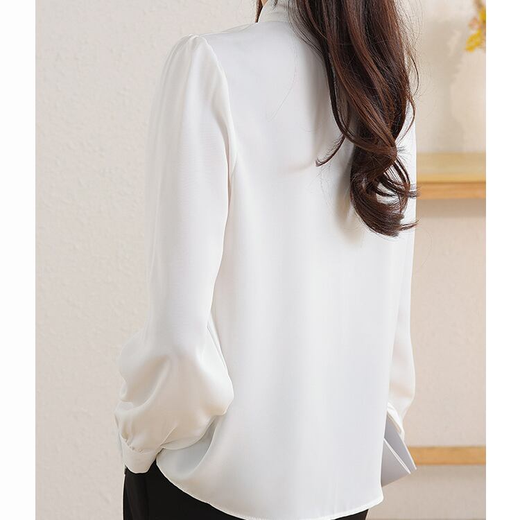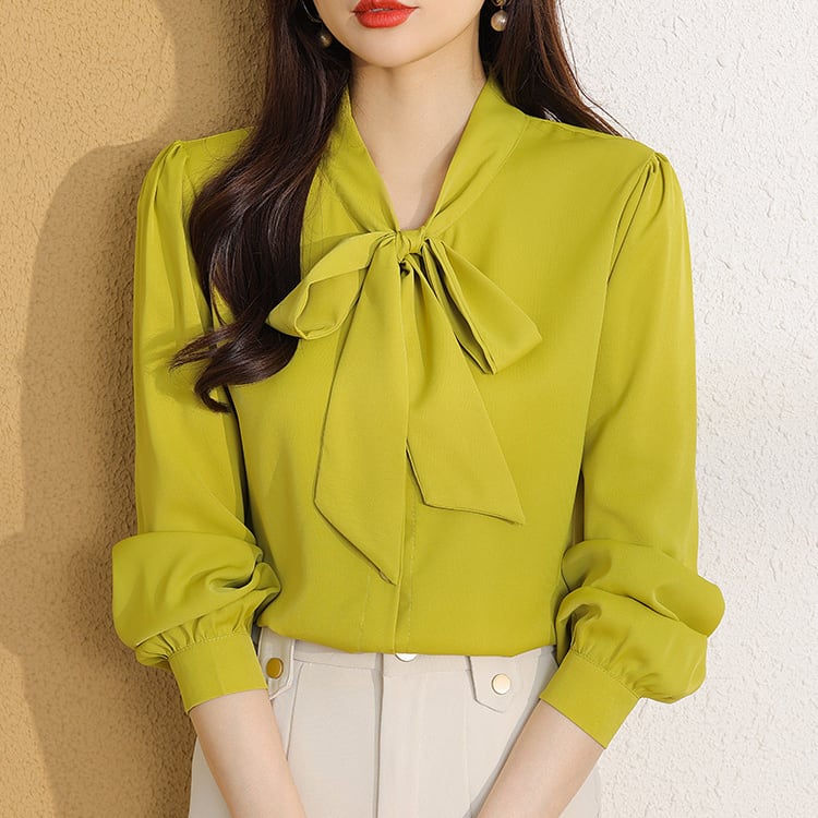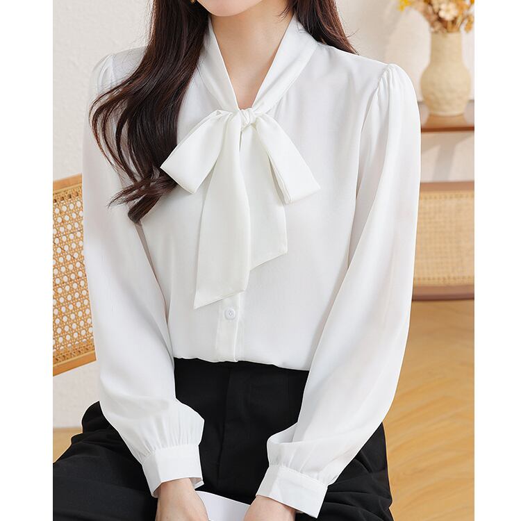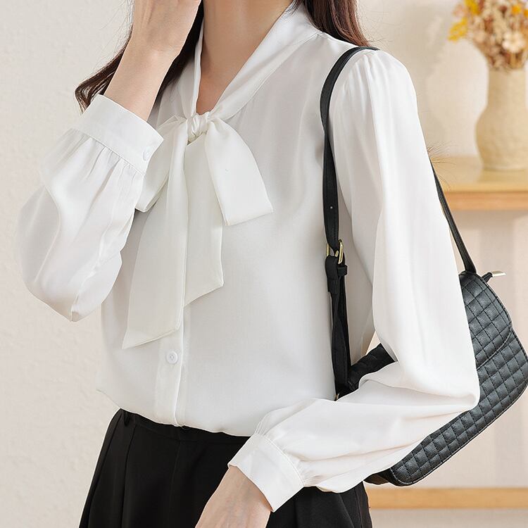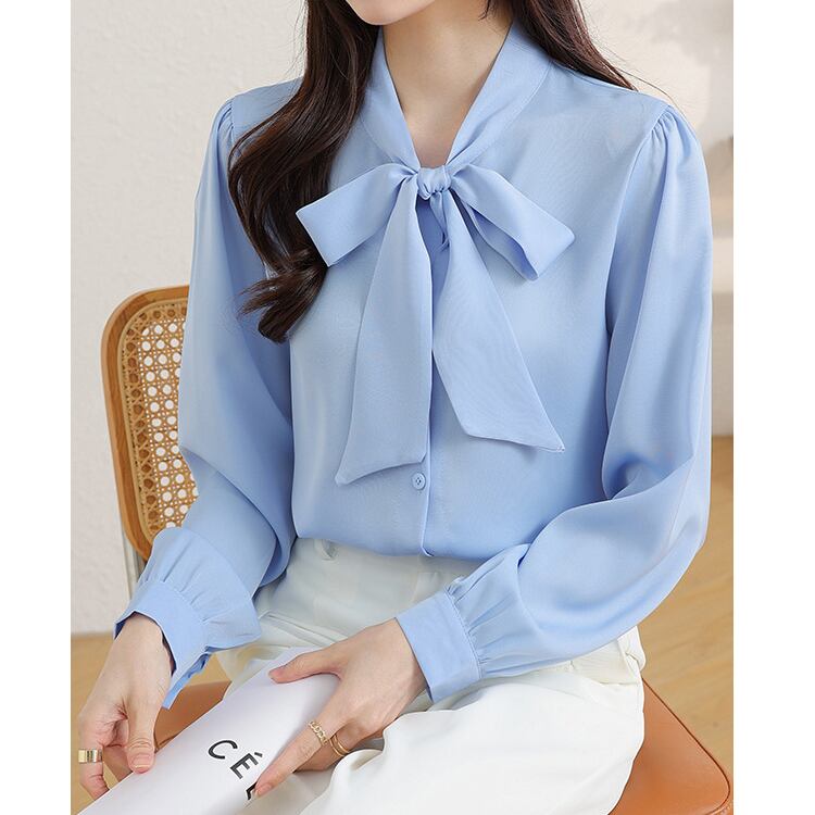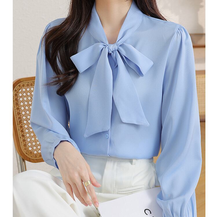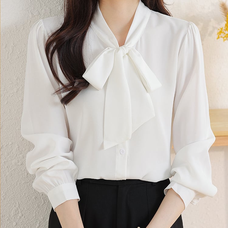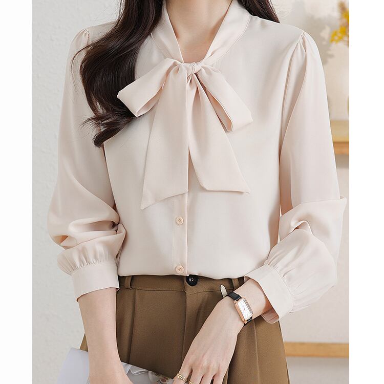 クラシカルなリボンタイが上品な印象を与える、前開きデザインの長袖ブラウス。
