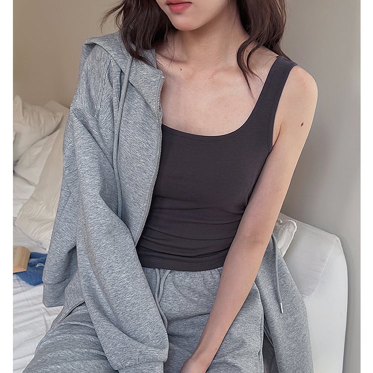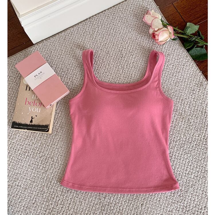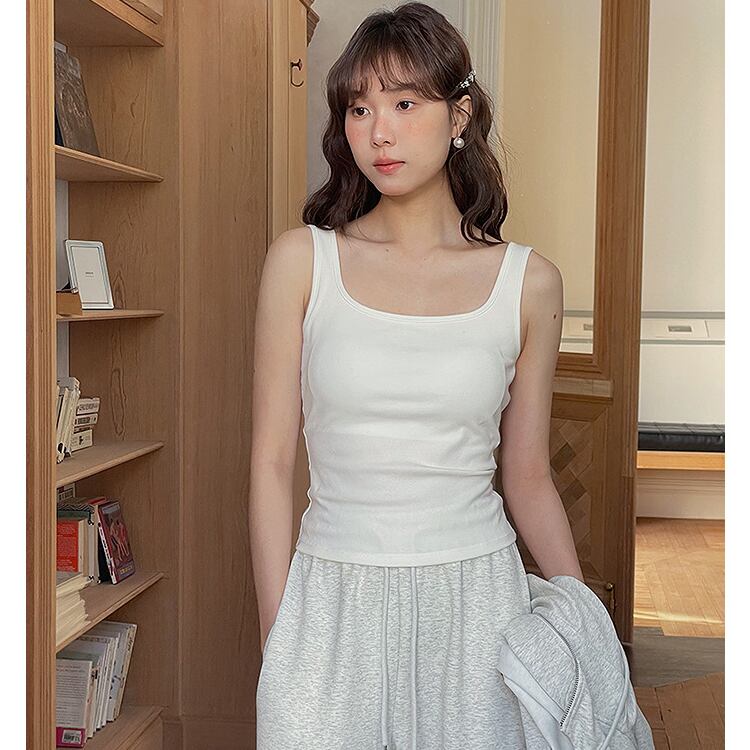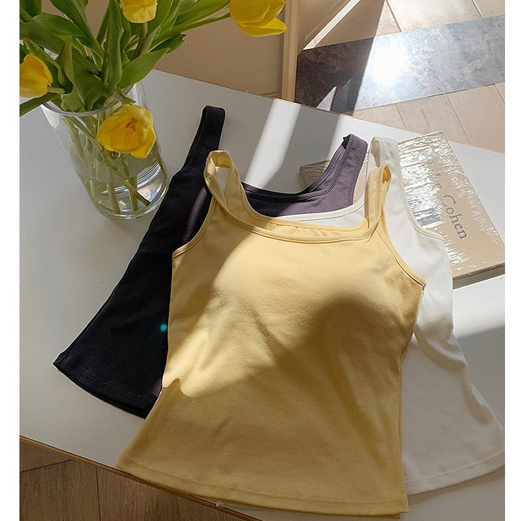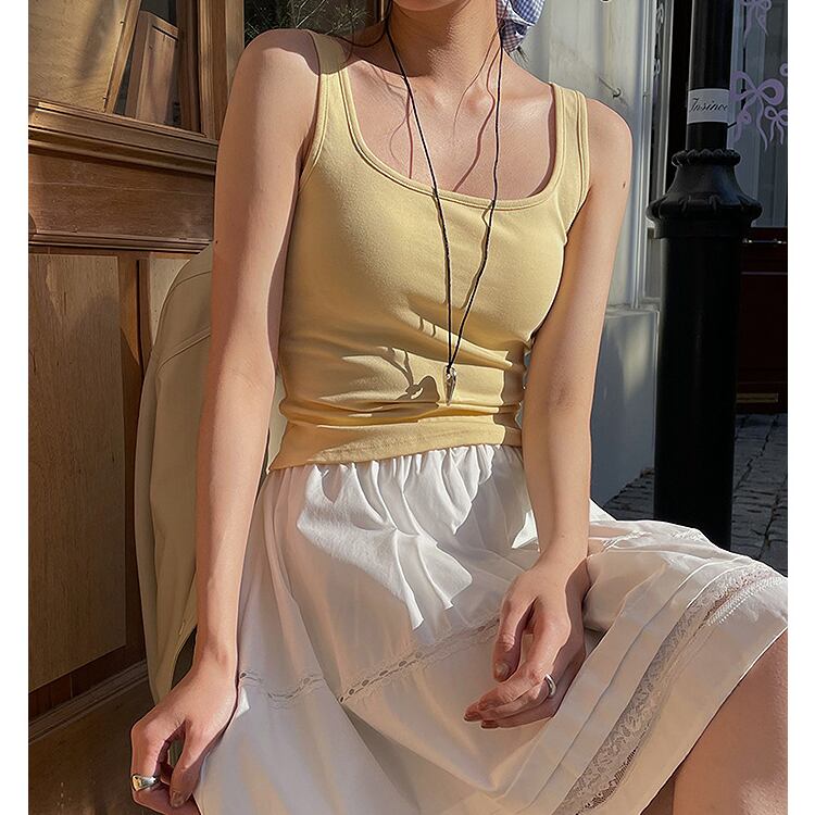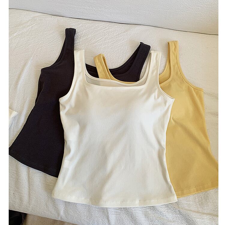 シンプルながら洗練された印象を与える、スクエアネックのブラトップタンクトップ。