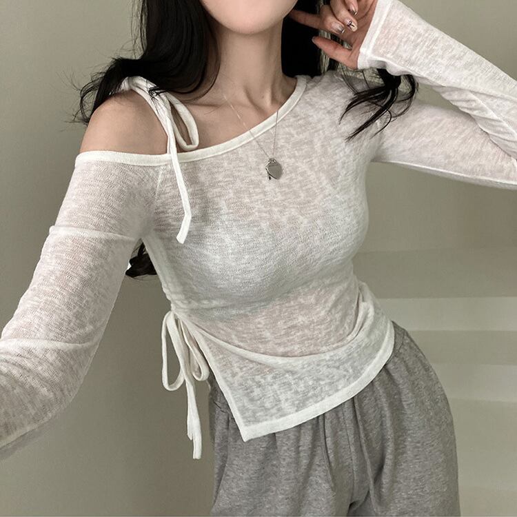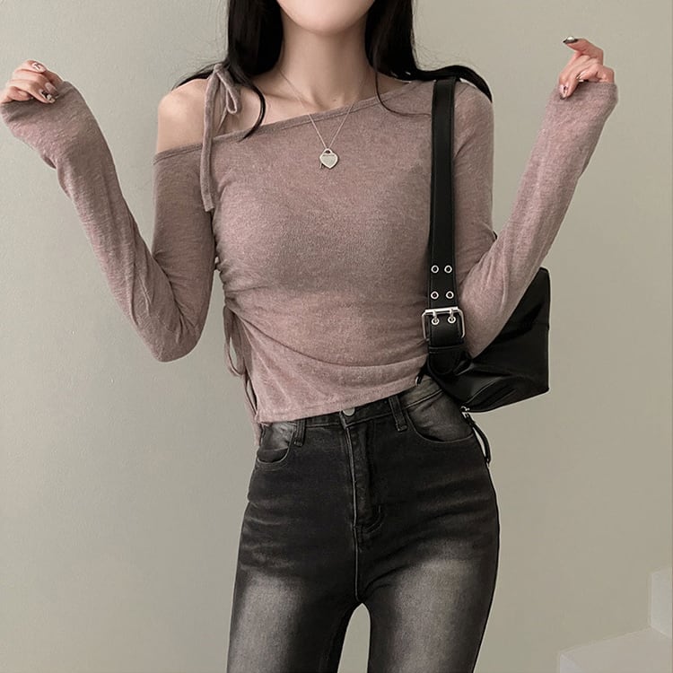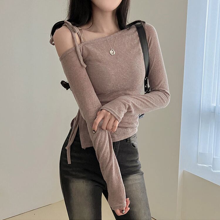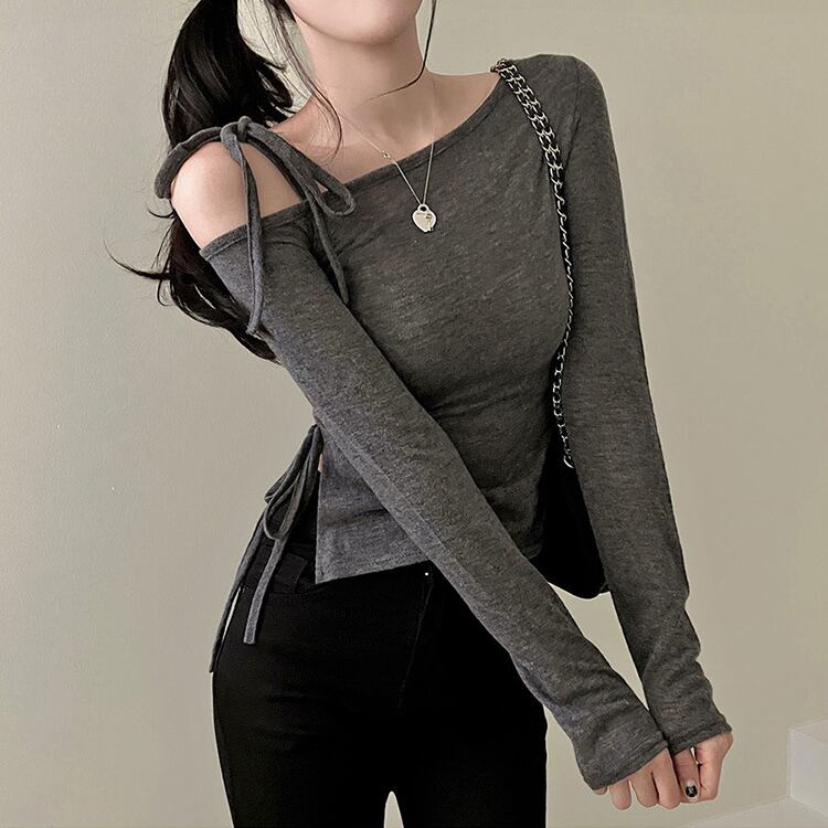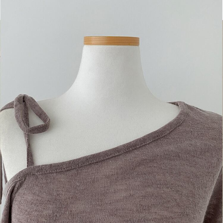 レディース トップス カットソー 長袖 オフショルダー ワンショルダー 襟なし ノーカラー アシンメトリーネック タイト スリム 細身 フェミニン リボン スリット ドロスト 大人可愛い カジュアル おしゃれ かっこいい こなれ感 ラフ 個性的 クール 存在感 ワイルド セクシー 色気 無地 春 秋 デート お出かけ パーティー イベント 旅行 女子会 休日 ショッピング コンサート ライブ コーデ モテ インスタ映え ボディコンシャス ワンサイズ 白 ホワイト ブラウン ダークグレー ベーシックカラー