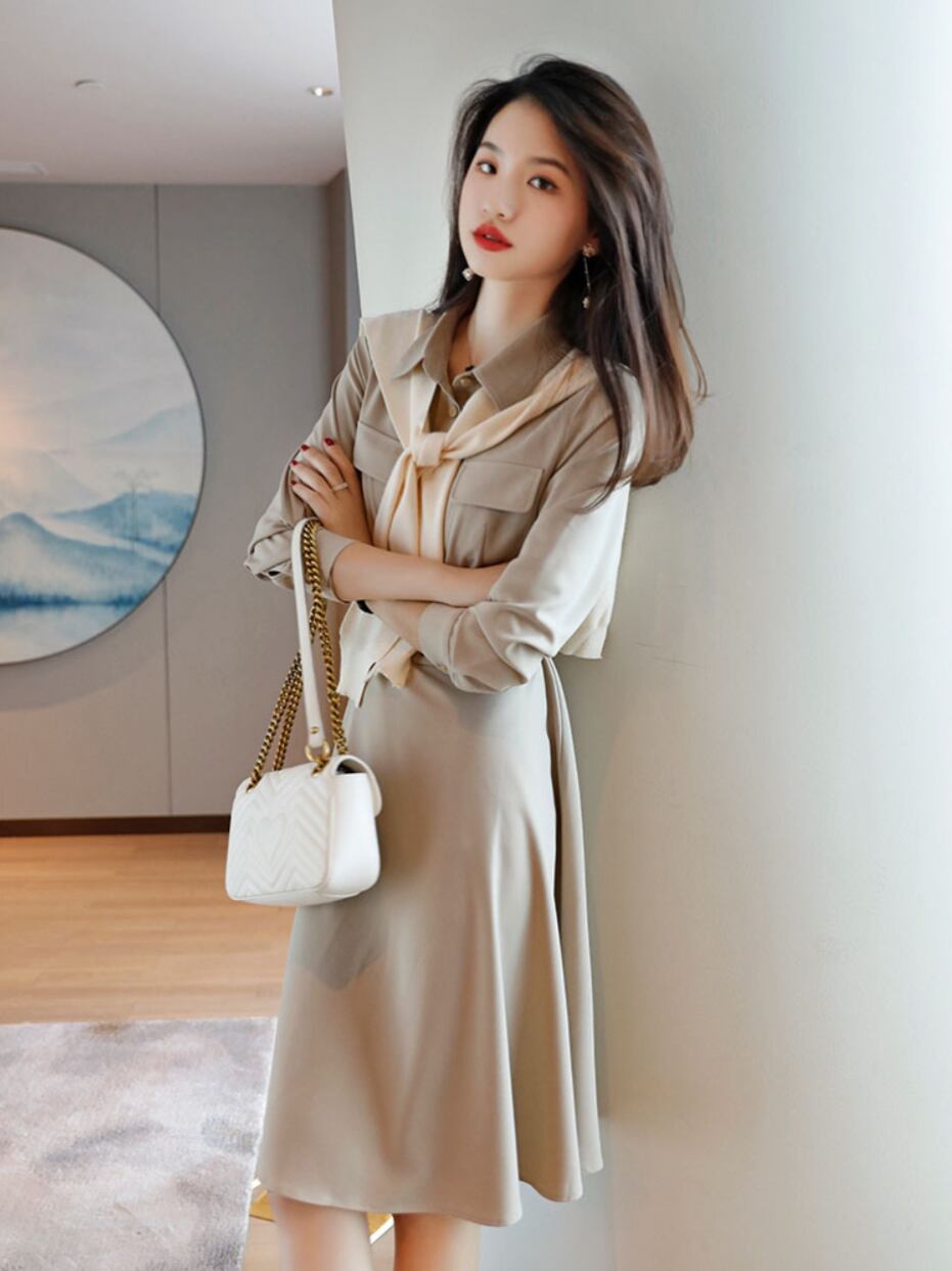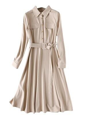 セミフレアの Aラインが女性らしさを引き立てる、シャツワンピース。