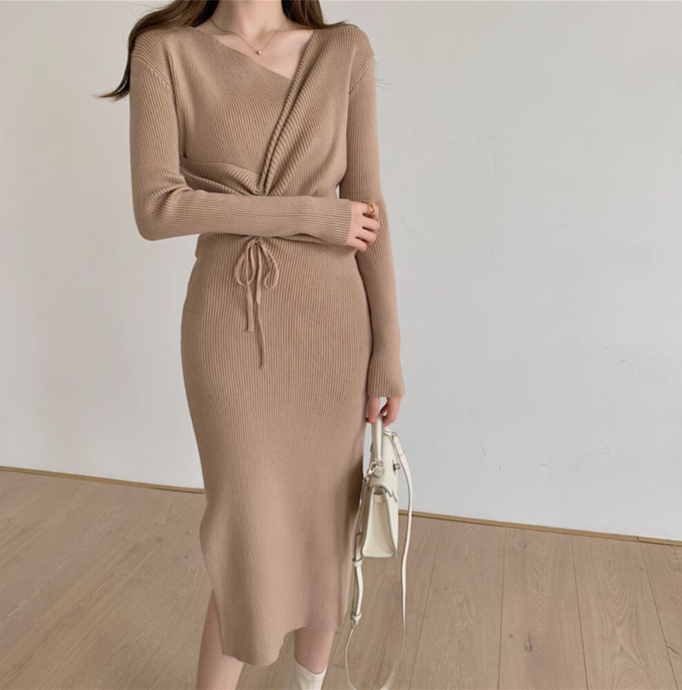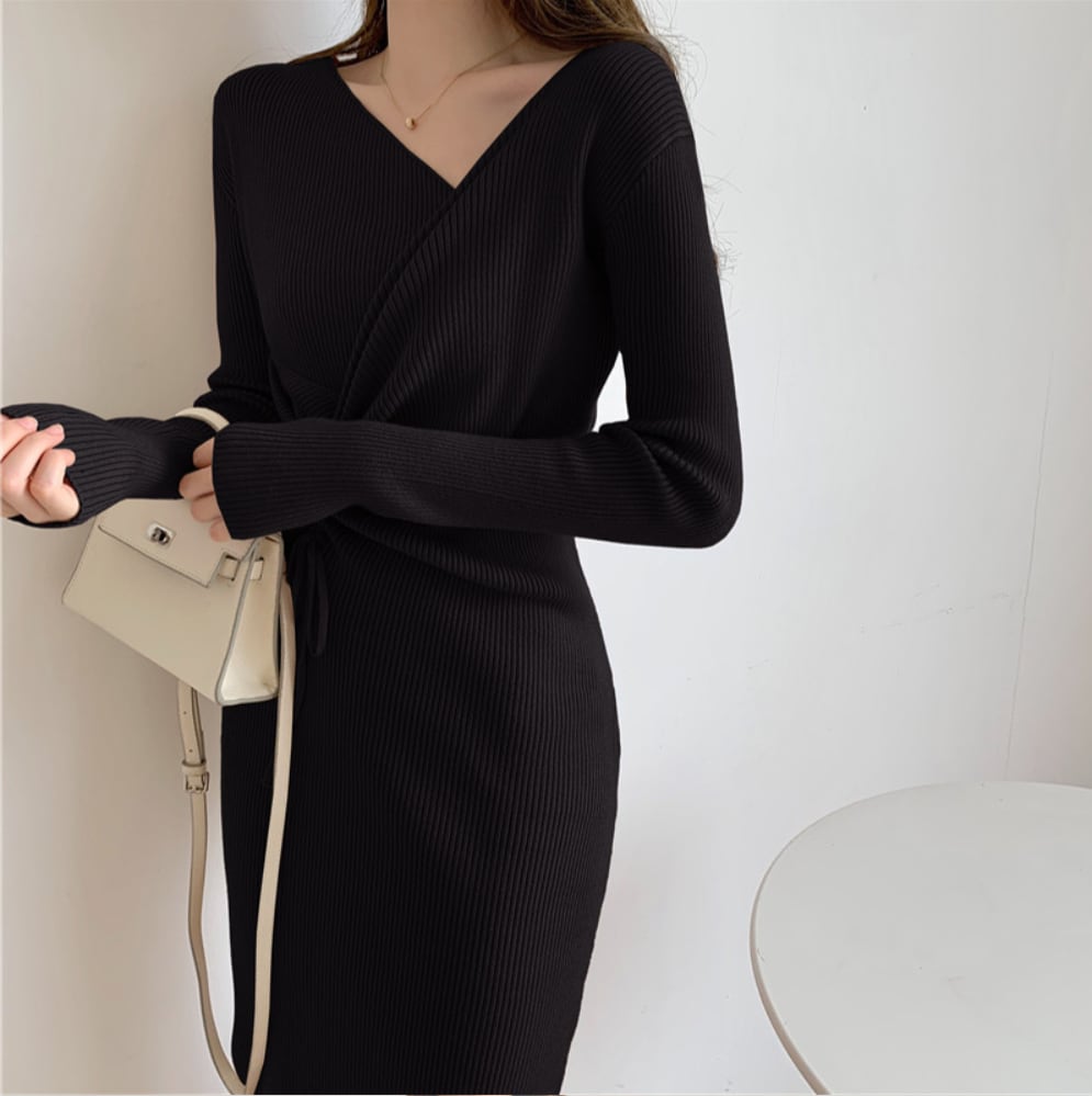 レディース ワンピース レディース ミモレ 長袖 Vネック 襟なし タイト スリム 細身 リボン ウエストマーク ウエストリボン ハイウエスト 肌見せ ニット きれいめ シンプル 上品 おしゃれ かっこいい クール 存在感 クラシカル ナチュラル 無地 秋 冬 デート お出かけ イベント 旅行 レストラン 女子会 休日 高原 ホテル ガーデン ショッピング 発表会 コンサート 合コン コンパ カフェ 婚活 モノトーン ランチ お呼ばれ 韓国 オルチャン 着回し 清楚 S M L XL 黒 ブラック カーキ
