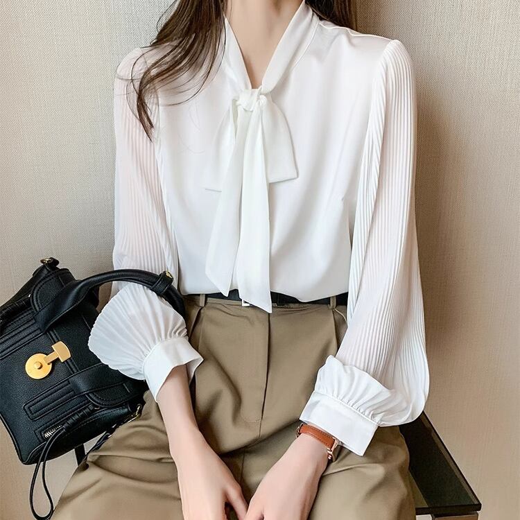 上品で大人可愛い印象を演出する、リボンタイ付き長袖ブラウス。