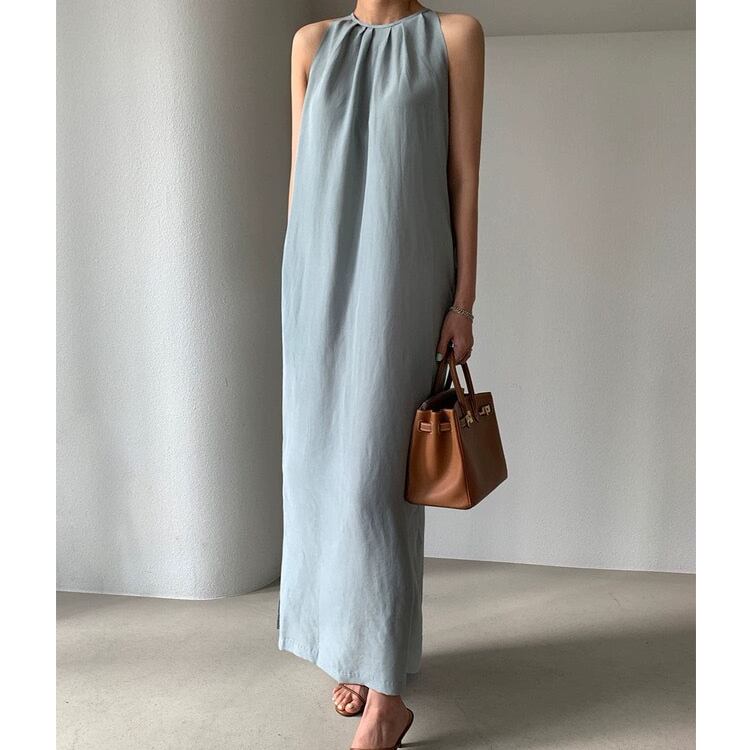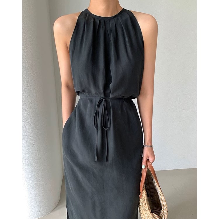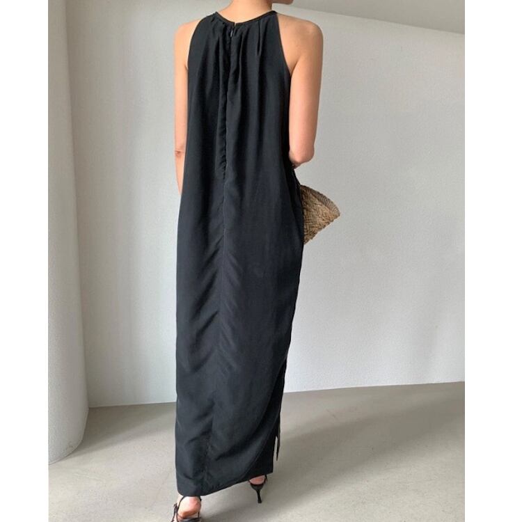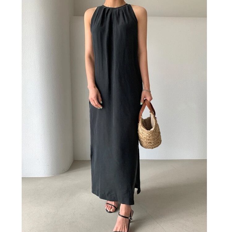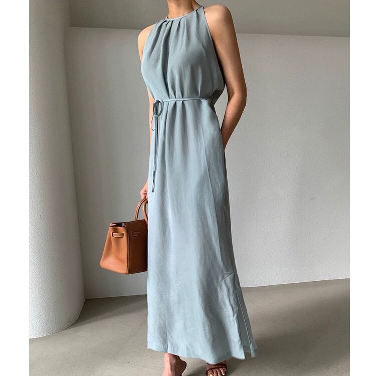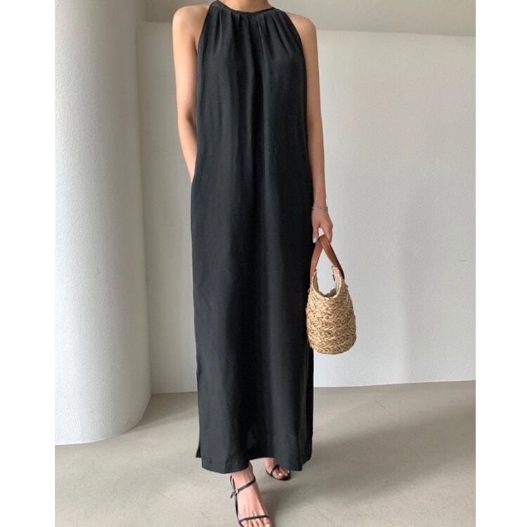 レディース ワンピース ボトムス ロング 袖なし ホルターネック 襟なし ノーカラー スリム 細身 ストレート Iライン フェミニン リボン ウエストマーク サイドスリット かわいい 大人可愛い きれいめ シンプル 上品 おしゃれ かっこいい こなれ感 エレガント 存在感 クラシカル ベーシック 涼しげ 軽やか セクシー 色気 無地 夏 ママ OL デート お出かけ パーティー イベント 旅行 レストラン カフェ ランチ お呼ばれ オケージョン コーデ スタイルアップ ワンサイズ 黒 ブラック ブルー