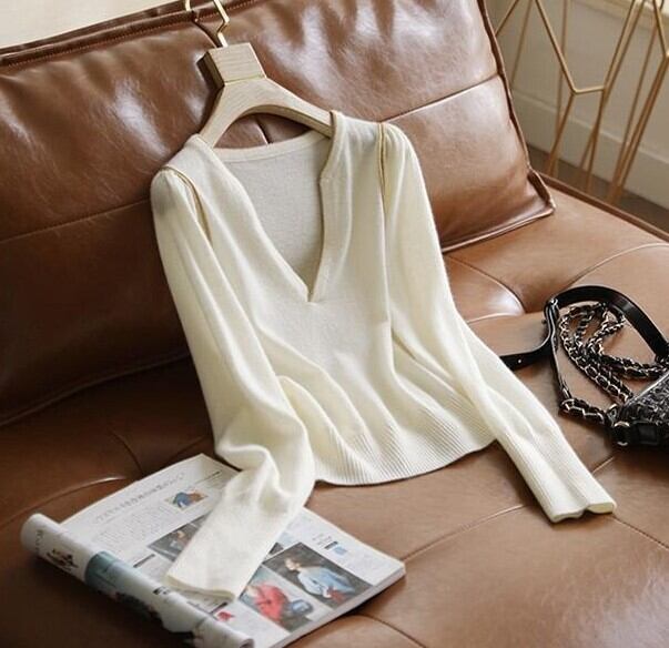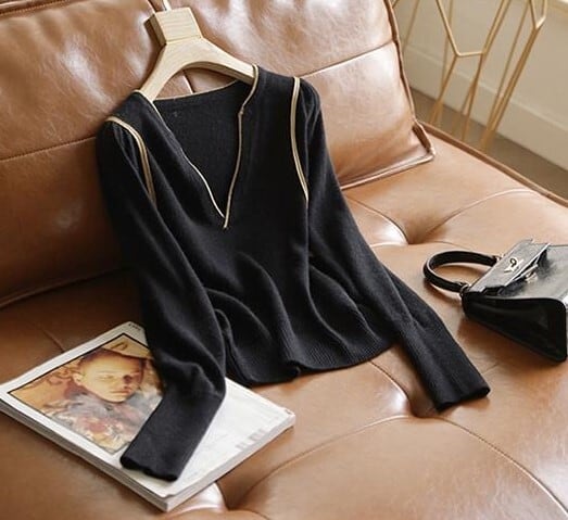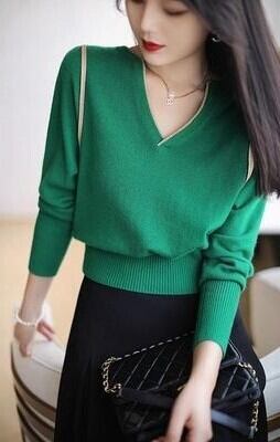 深みのあるグリーンをはじめ、ホワイト・ブラックのベーシックカラーも揃ったレディースニットは、Vネックデザインで首元を美しく見せ、女性らしい品のある印象を演出します。肩とネックラインに施されたゴールドのラインがアクセントとなり、シンプルながら洗練された雰囲気を漂わせます。