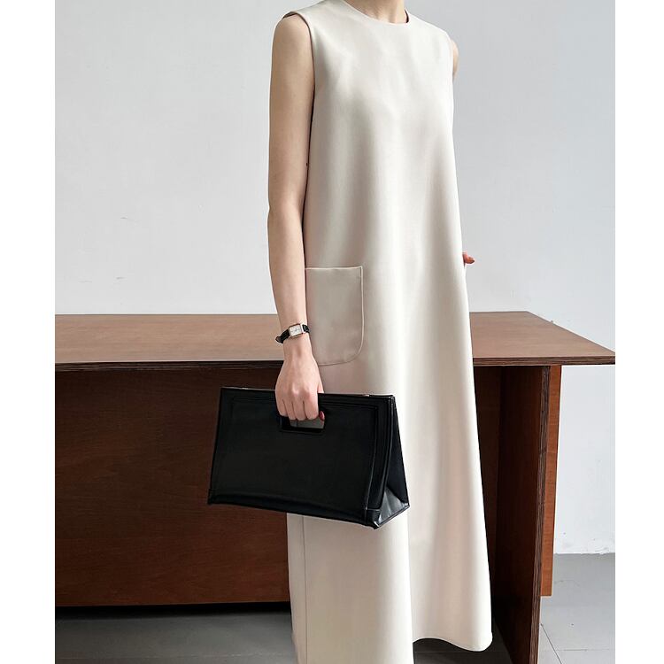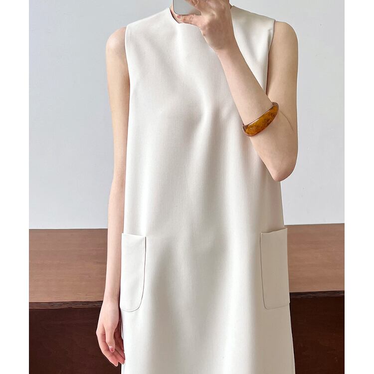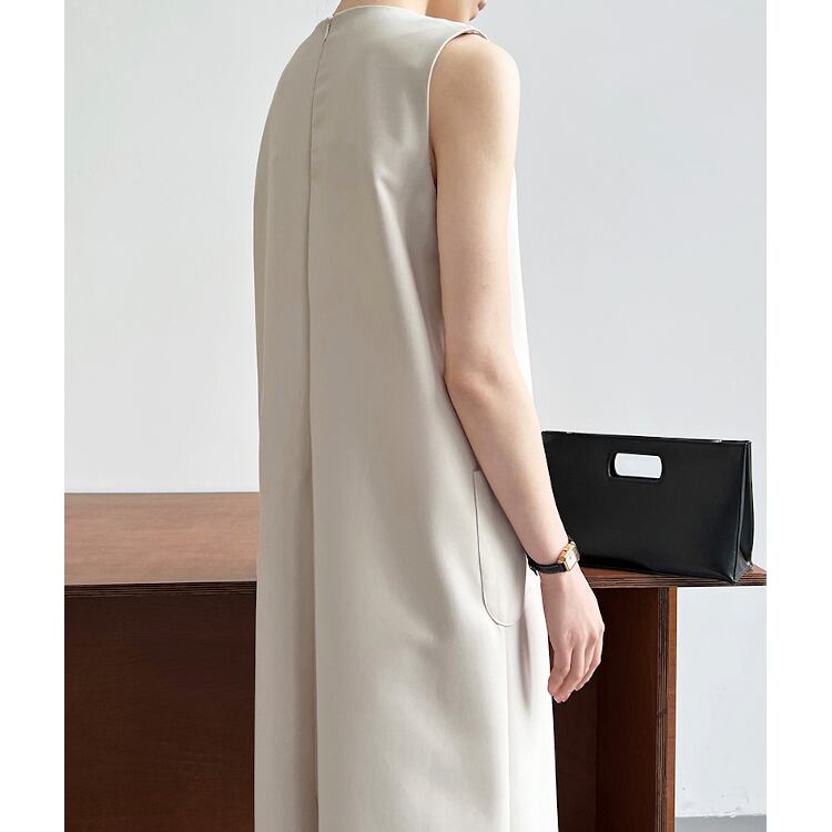 レディース ワンピース ミモレ 袖なし ノースリーブ ラウンドネック 襟なし ノーカラー スリム ストレート Iライン フェミニン スリット バックスリット ファスナー ポケット コンサバ きれいめ シンプル 上品 おしゃれ こなれ感 無地 夏 授業参観 ママ デート お出かけ パーティー イベント 旅行 女子会 休日 ショッピング コンサート モノトーン お呼ばれ オケージョン コーデ 体型カバー 普段使い 着回し 清楚 定番 M L 黒 ブラック ベージュ モノトーン ベーシックカラー 大人カラー