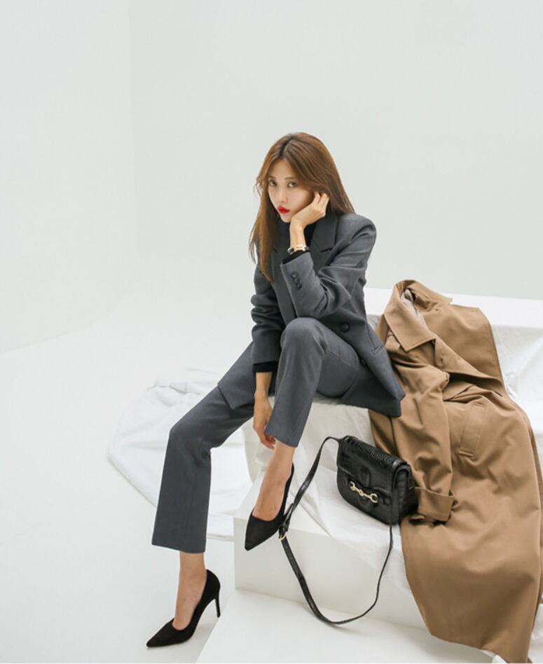 アンクル丈のパンツは美脚効果を引き出し、都会的でクラシカルな印象を与えます。長袖の襟付きトップスとストレートパンツの絶妙なコンビネーションは、入学式や卒業式、ビジネスシーンなど、多彩なシーンで活躍するアイテムです。