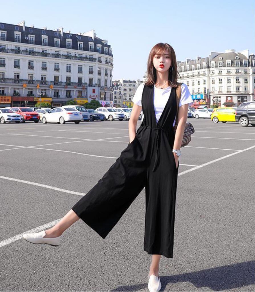 7分丈のガウチョパンツは動きやすく、カジュアルなお出かけにも最適です。ノースリーブのVネックトップスは、大人可愛い印象を与え、さりげなく女性らしさを引き立てます。ポケットも付いているので、機能性もバッチリです。
