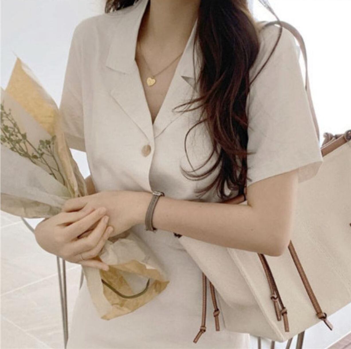 Vネックと襟付きのデザインが上品さを演出し、フレアAラインが女性らしいシルエットを引き立てます。ウエストマークでハイウエストに仕上げているため、スタイルアップ効果も抜群です。普段使いやデート、お出かけ、リゾートなど、さまざまなシーンで着回せる一枚です。
