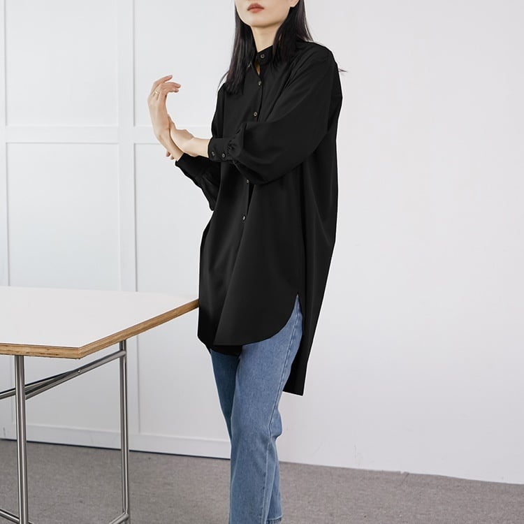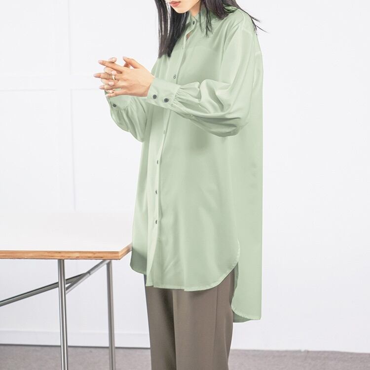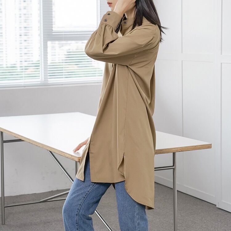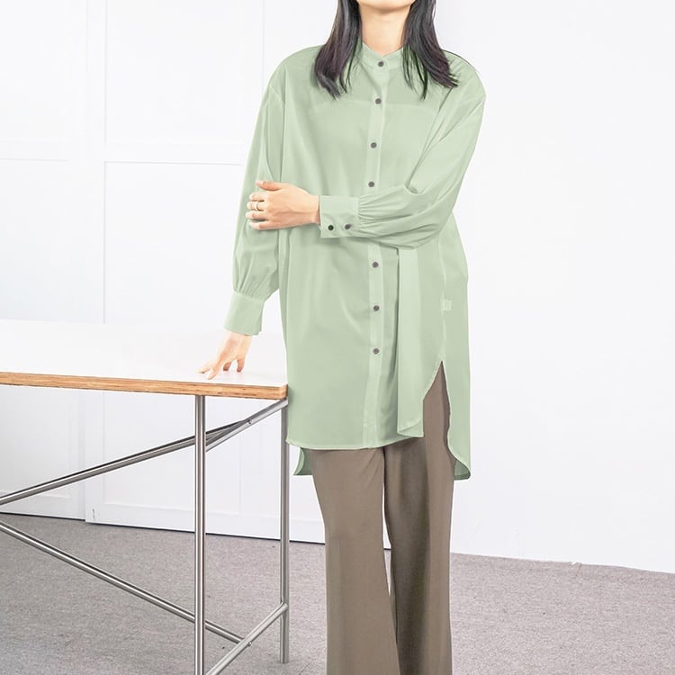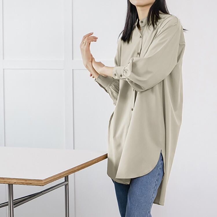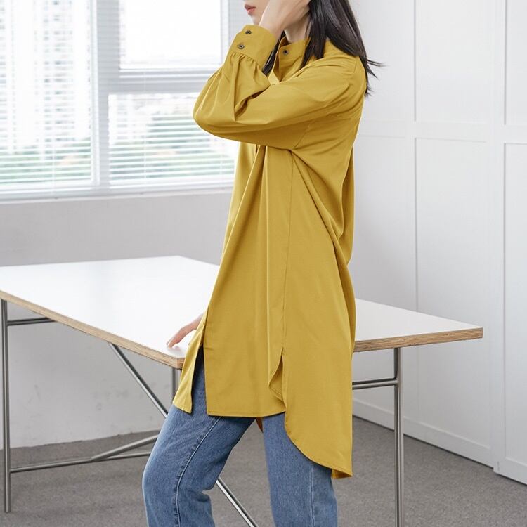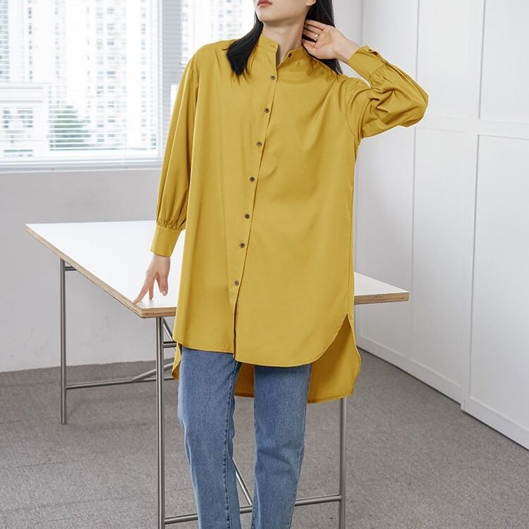 レディース トップス シャツ 膝上 長袖 スタンドカラー フェミニン 前開き ボタン かわいい 大人可愛い きれいめ シンプル カジュアル 上品 おしゃれ こなれ感 ラフ マニッシュ 個性的 クール 抜け感 OL 通勤 デート お出かけ 旅行 レストラン 女子会 休日 ホテル ガーデン ショッピング コンサート ライブ アースカラー 韓国 体型カバー 普段使い 着回し インスタ映え 定番 M L ホワイト ブラック ブラウン イエロー カーキ グリーン ベーシックカラー 大人カラー 春カラー 秋カラー
