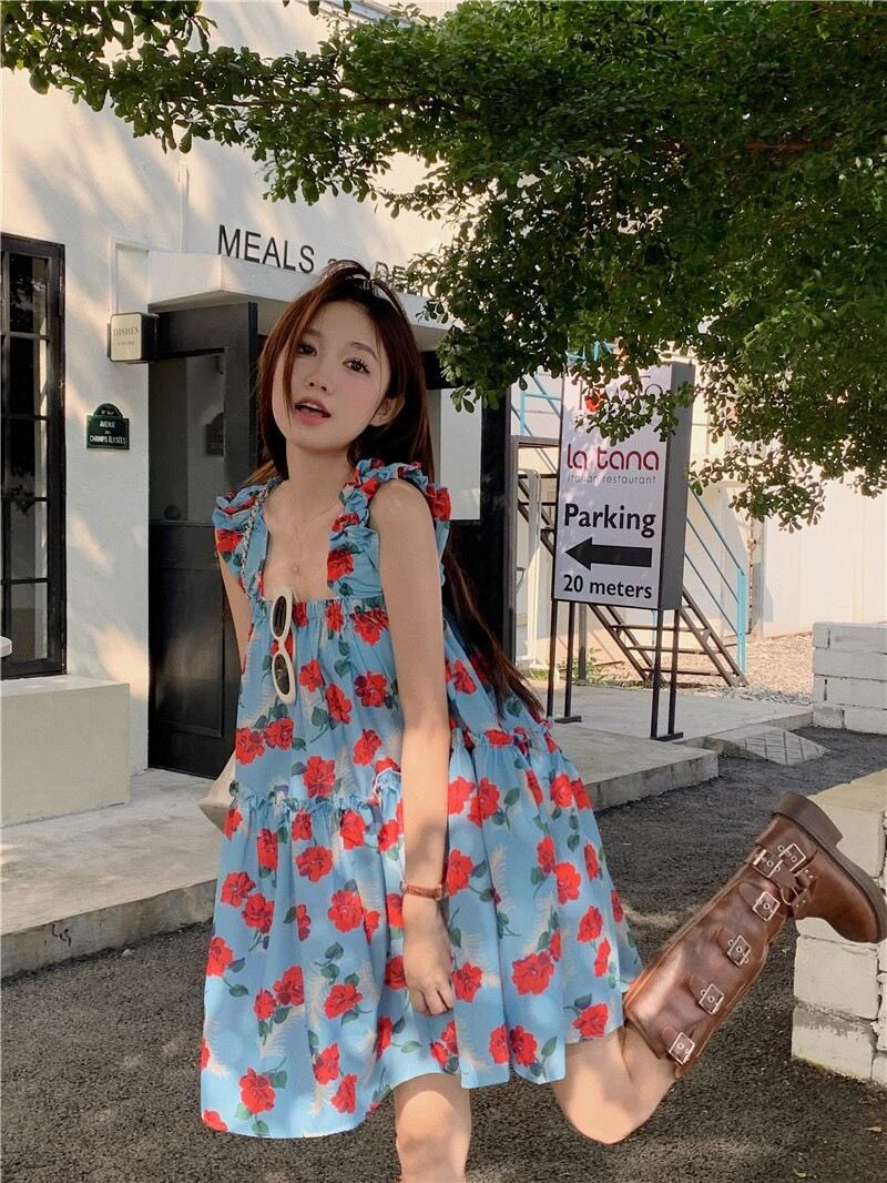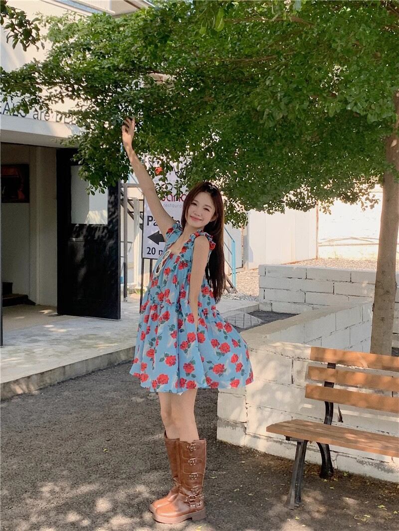 ロマンティックなムードを纏う、バラ柄のティアードミニワンピース。目を引く鮮やかなレッドのバラが、爽やかなライトブルーの生地に咲き誇り、まるで絵画のような美しいコントラストを生み出します。胸元からふんわりと広がるティアードシルエットが、動くたびに軽やかに揺れ、愛らしい印象を際立たせます。さらに、肩にあしらわれたフリルが、さりげない華やかさをプラス。スクエアネックで首元をすっきりと見せつつ、デコルテラインを綺麗に演出します。