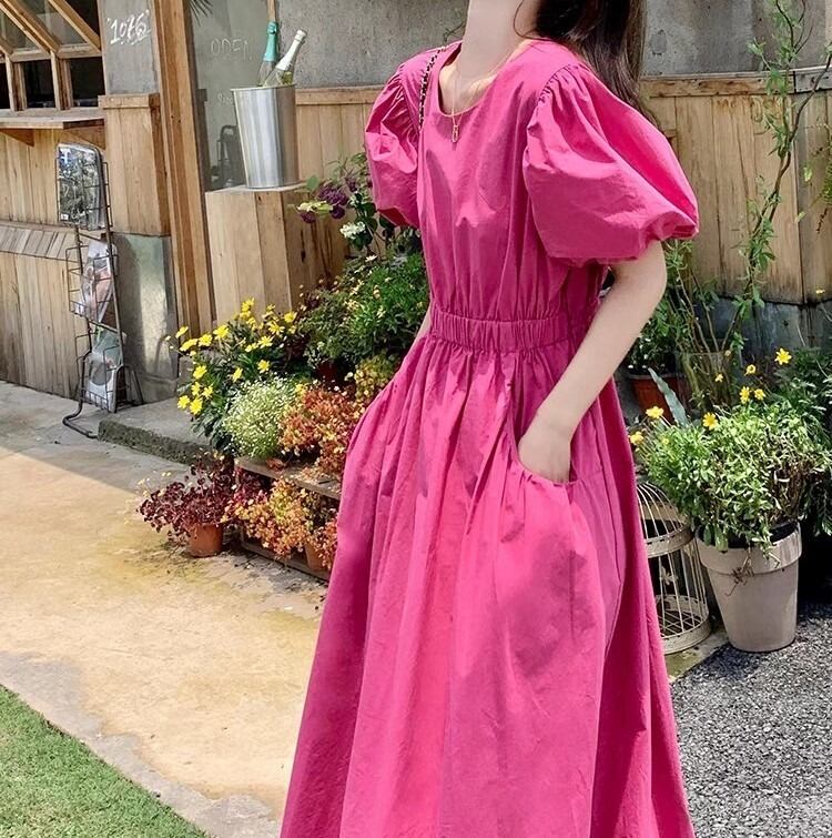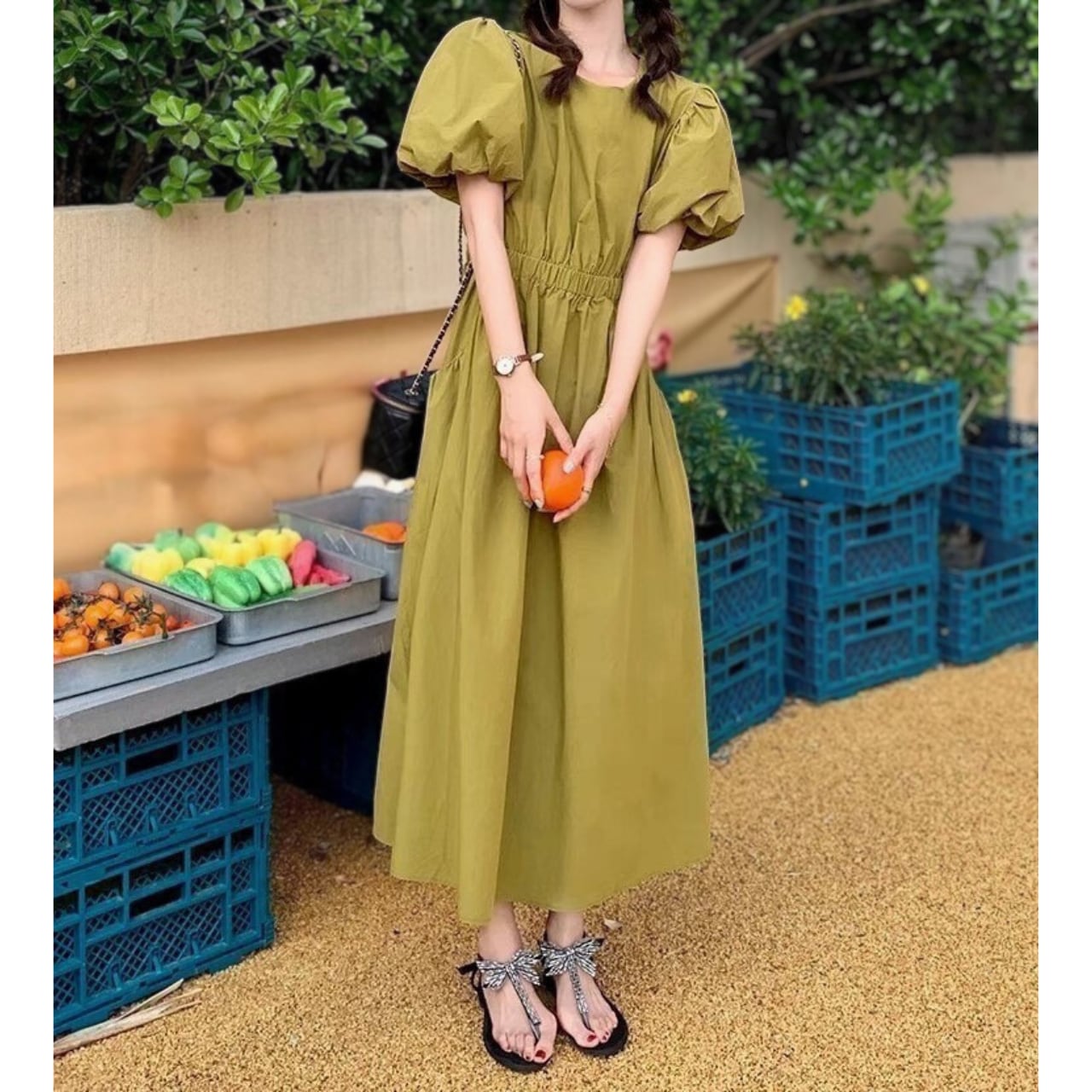 レディース ワンピース 膝下 ミモレ 丈長 ボリューム袖 パフスリーブ ラウンドネック 襟なし ノーカラー フレア Aライン 切り替え 背中開き フェミニン ウエストマーク ハイウエスト 大人可愛い きれいめ シンプル カジュアル 上品 エレガント 主役級 存在感 ロマンティック ナチュラル 清潔感 爽やか 無地 春 夏 ロングシーズン ママ 学生 デート お出かけ リゾート 旅行 女子会 バカンス ショッピング カフェ ランチ 体型カバー 清楚 S M L XL 大人カラー ライトグリーン ローズレッド