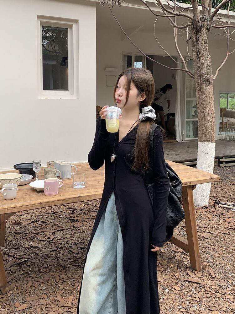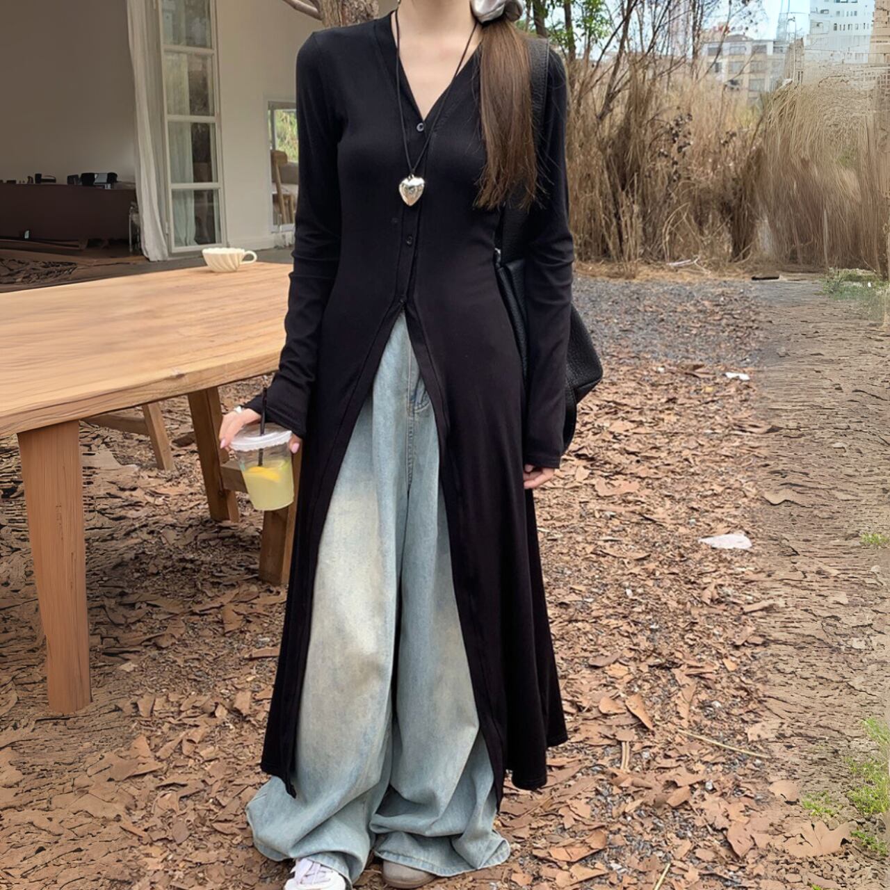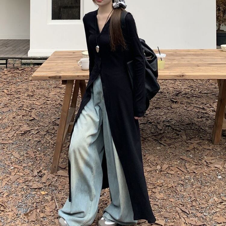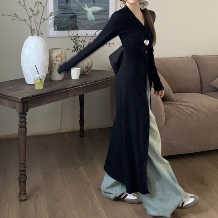 レディース トップス ニット カーディガン 上着 羽織 前開き ロング 丈長 長袖 萌袖 Vネック 襟なし ノーカラー スリム ストレート Iライン シングルブレスト きれいめ シンプル カジュアル おしゃれ こなれ感 主役級 存在感 ナチュラル 清潔感 爽やか シック 無地 秋 冬 ロングシーズン ママ 学生 デート お出かけ 旅行 女子会 休日 ショッピング カフェ ランチ 重ね着 暖かい 普段使い 着回し レイヤード インスタ映え ワンサイズ 黒 ブラック モノトーン ベーシックカラー 大人カラー