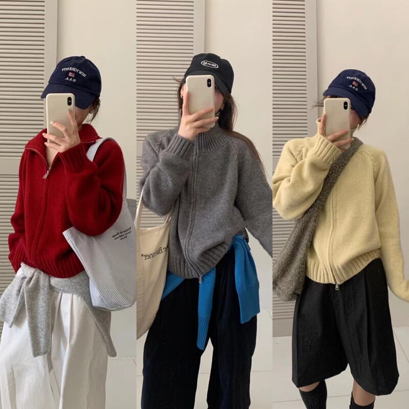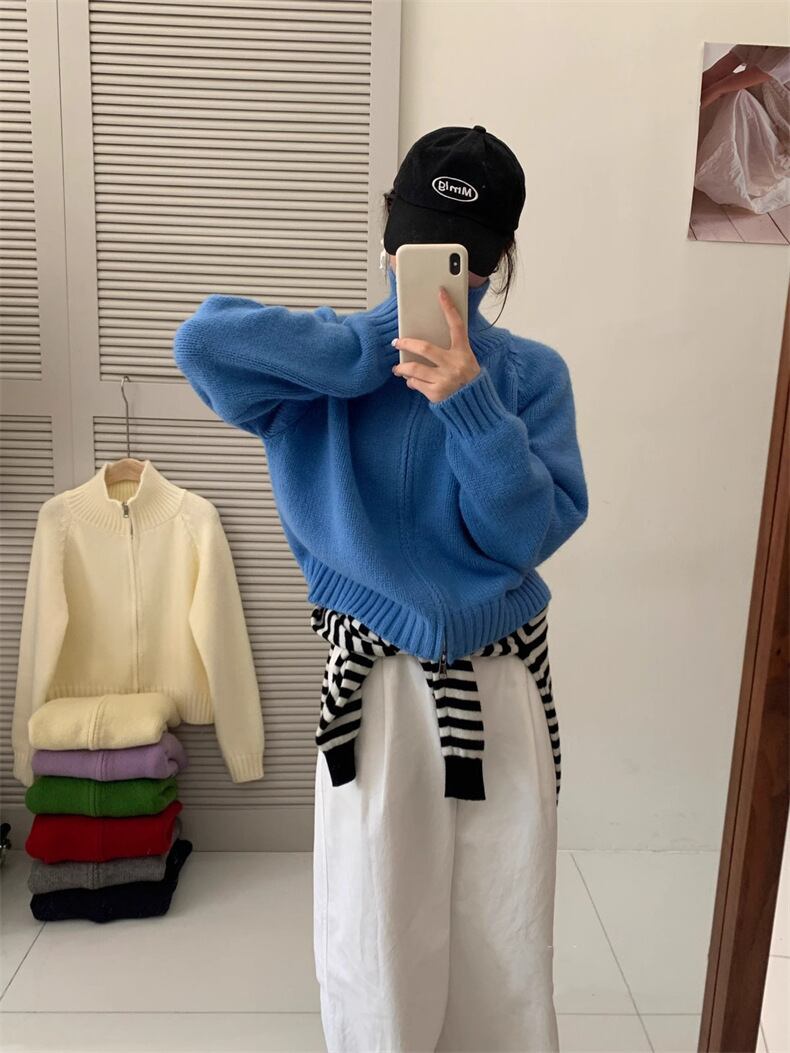 レディース トップス ジャケット ニット セーター カーディガン ブルゾン アウター 上着 ハイネック ジップアップ ワイド オーバーサイズ ファスナー 前開き かわいい カジュアル レトロ こなれ感 ラフ ルーズ 抜け感 リラックス エフォートレス アンニュイ Y2K 秋 冬 韓国 オルチャン 楽ちん 体型カバー 普段使い 着回し トレンド スタイルアップ ゆったり ゆる フリーサイズ ワンサイズ ぽっちゃり ブラック グレー オフホワイト ブルー レッド グリーン パープル カスタード ライトイエロー