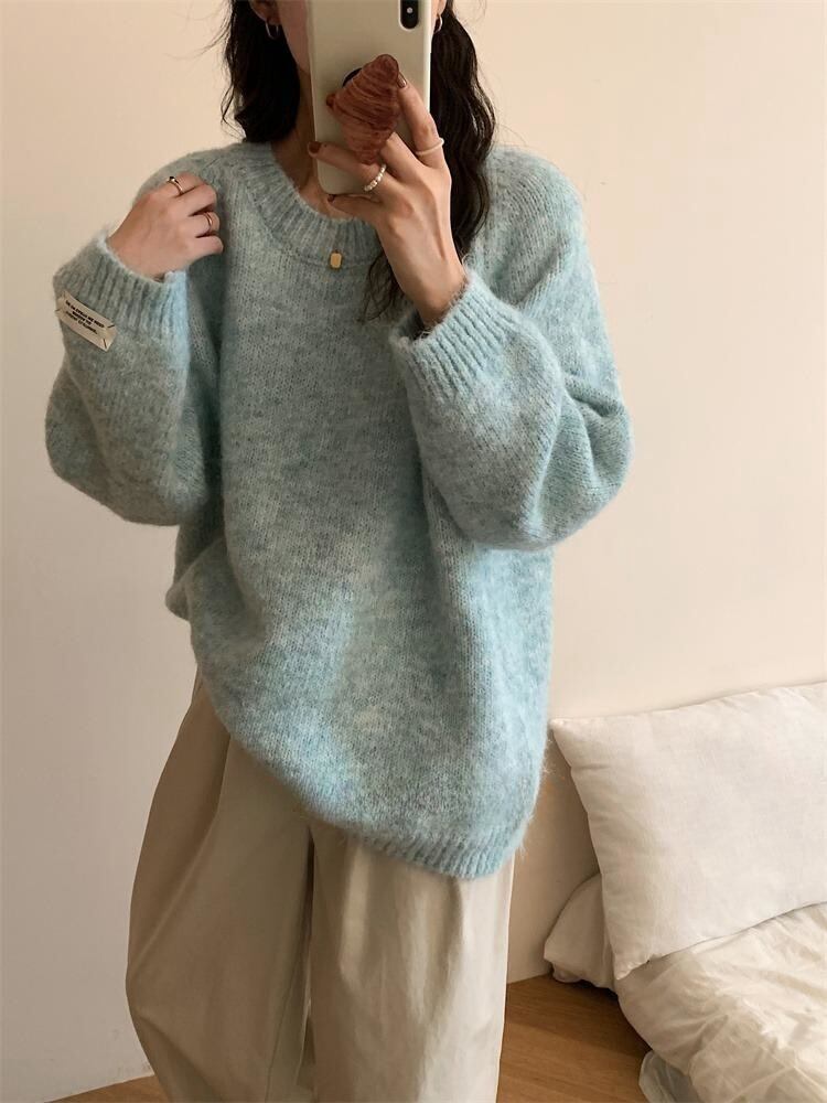 トップス セーター レディース 長袖 ラウンドネック ゆったり ふわふわ かわいい 大人可愛い シンプル カジュアル おしゃれ こなれ感 ルーズ 個性的 存在感 キュート ベーシック ナチュラル 無地 秋 冬 オフィス OL 通勤 学生 学校 通学 デート お出かけ 女子会 休日 ショッピング カフェ ランチ コーデ 体型カバー 普段使い 着回し 定番 フリーサイズ オフホワイト ミントグリーン ピンク パープル ライトグレー ダークグレー 定番カラー