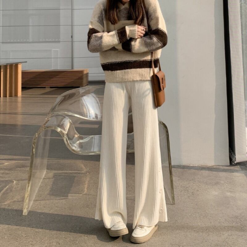 パンツ ボトムス ニット レディース ロング丈 幅広 ワイドレッグ ゆったり 楽ちん 定番 ハイウエスト 万能 シンプル デイリー 普段使い ボーイッシュ ストリート かわいい かっこいい 大人女子 大人可愛い キュート カジュアル 大人 おしゃれ お洒落 レトロ こなれ感 ラブリー ガーリー モード ルーズ 個性的 主役級 存在感 抜け感 韓国っぽ オルチャン デート 通勤 通学 学校 女子会 お出かけ 休日 秋 冬 ワンサイズ ホワイト キャメル 定番カラー