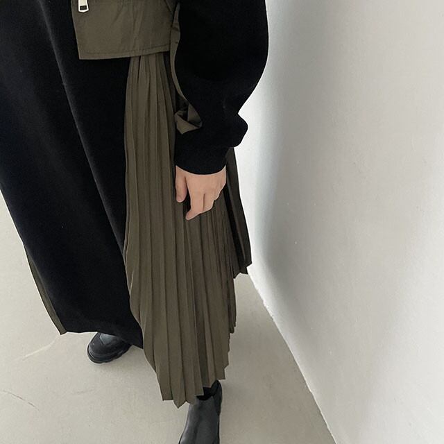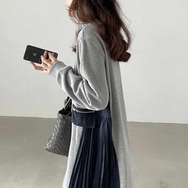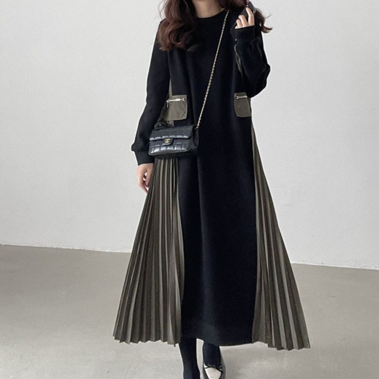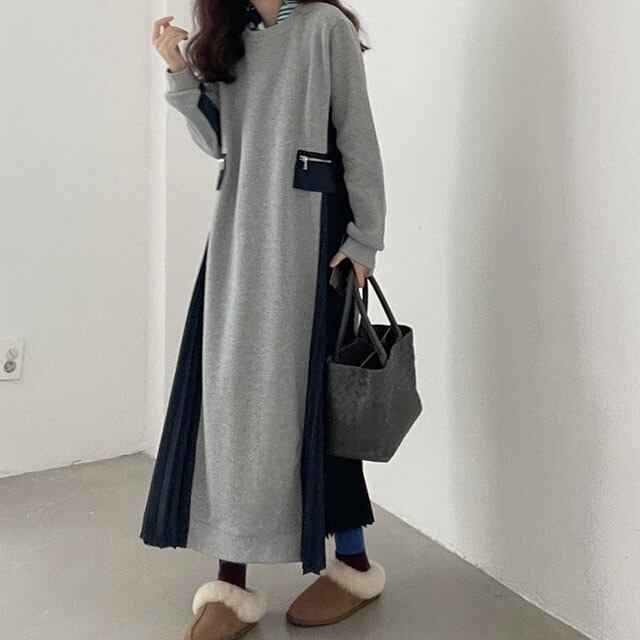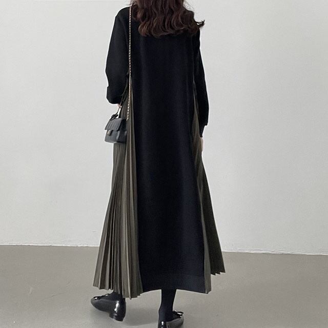 一枚で旬なスタイルが完成する、スウェットとプリーツの異素材ミックスワンピースです。カジュアルな着心地と、エレガントなプリーツの揺れ感が融合した、大人のためのハイブリッドデザインが魅力です。ゆったりとしたIラインの身頃は、お腹周りやヒップラインをさりげなくカバー。さらに、身頃のサイドパネルがプリーツに切り替わることで、縦のラインが強調され、全体のシルエットをすっきりと見せてくれます。長袖で足首までのロング丈は、露出を抑えたい方や、季節の変わり目に重宝する一枚です。