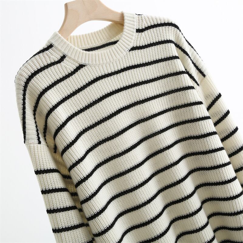 こちらのセーターは、ドロップショルダーとゆったりとしたルーズシルエットで抜け感を演出。ローゲージの厚手リブニットが暖かく、秋冬の普段使いにぴったりです。シンプルでカジュアルな中に、大人可愛いレトロな雰囲気が漂い、楽ちんに着られるのも嬉しいポイント。体型カバーにも優れ、着回し力の高い定番アイテムです。ホワイトベースのボーダー柄が、こなれ感のあるスタイルを叶えてくれます。