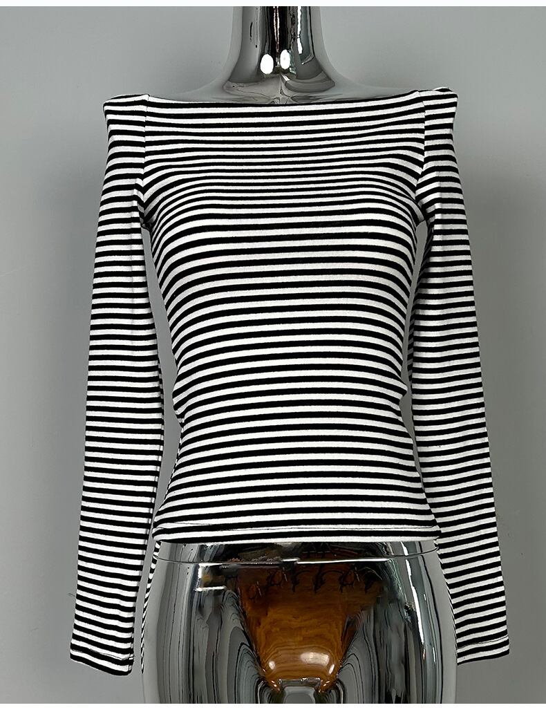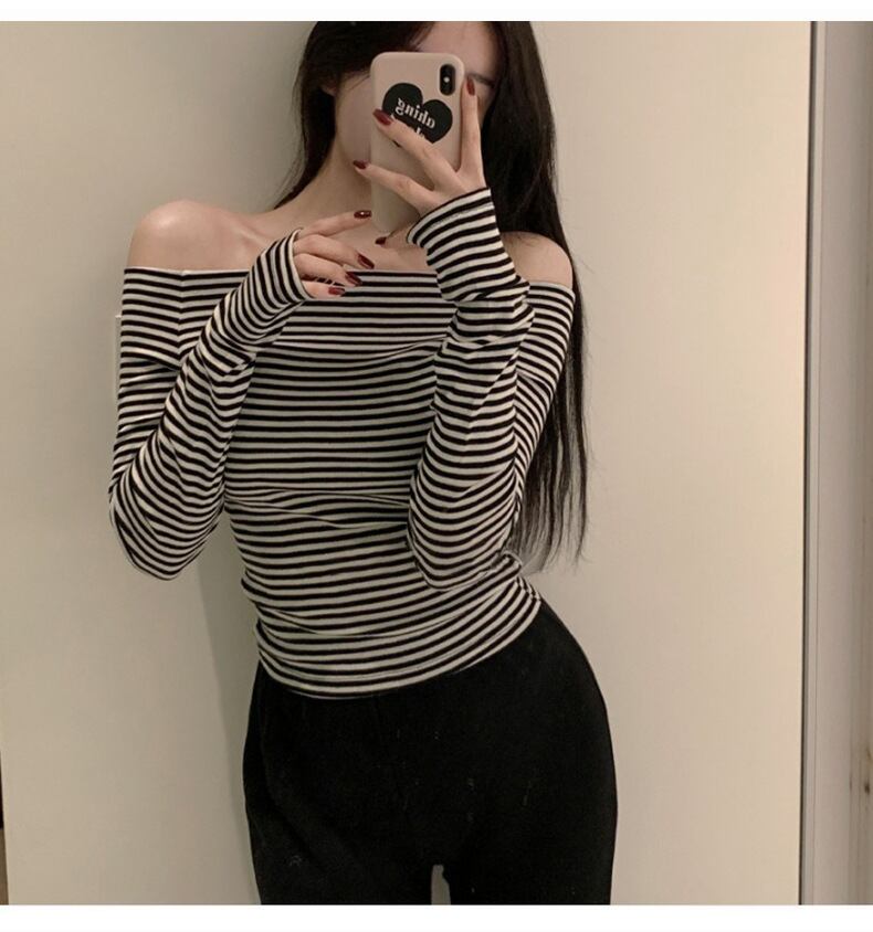 ショート丈とスリムフィットの組み合わせが絶妙なカットソーは、スタイルアップ効果も抜群。オフショルダーのデザインが抜け感とセクシーさを引き立て、ストレッチ性のある素材で楽ちんに着こなせます。シンプルでシックなモノトーンボーダー柄が、大人可愛い雰囲気を演出し、カジュアルな普段使いにもぴったり。春秋の季節に活躍する、モテを意識したスタイルに自然となじむ一枚です。