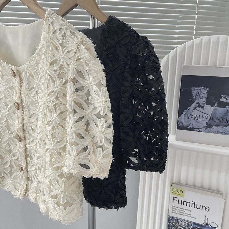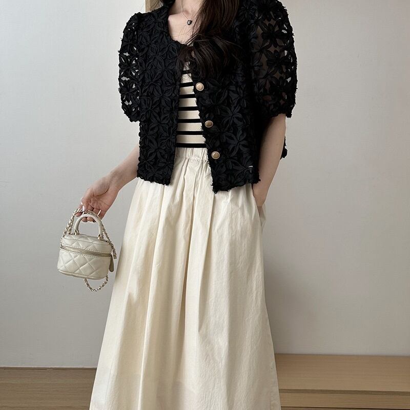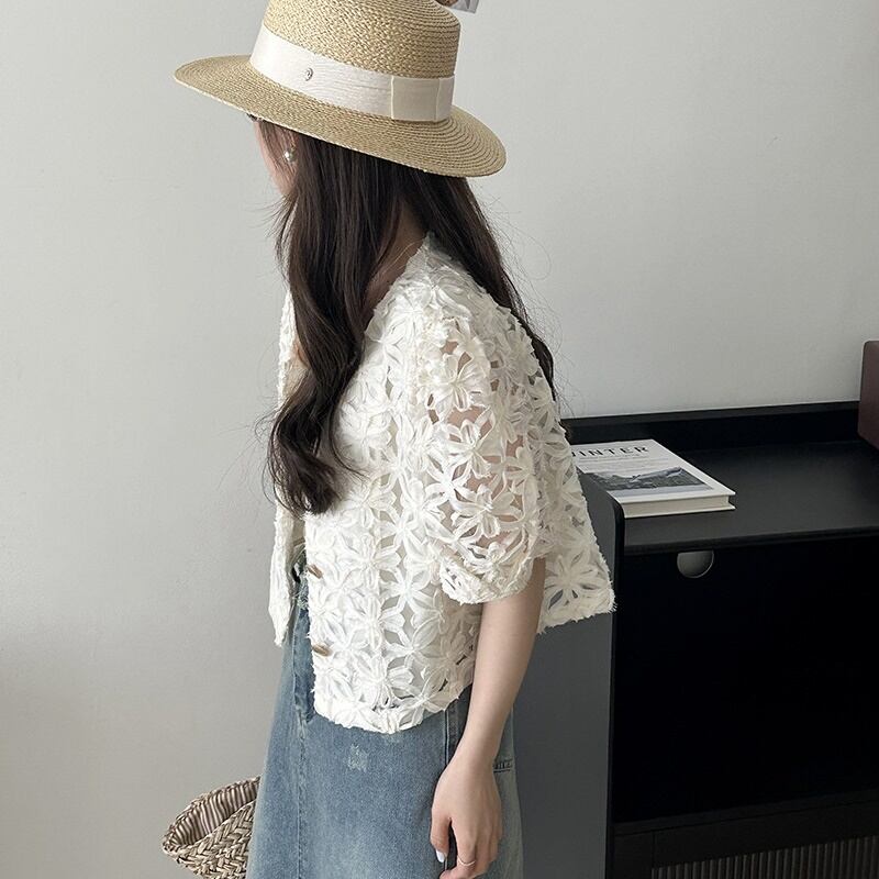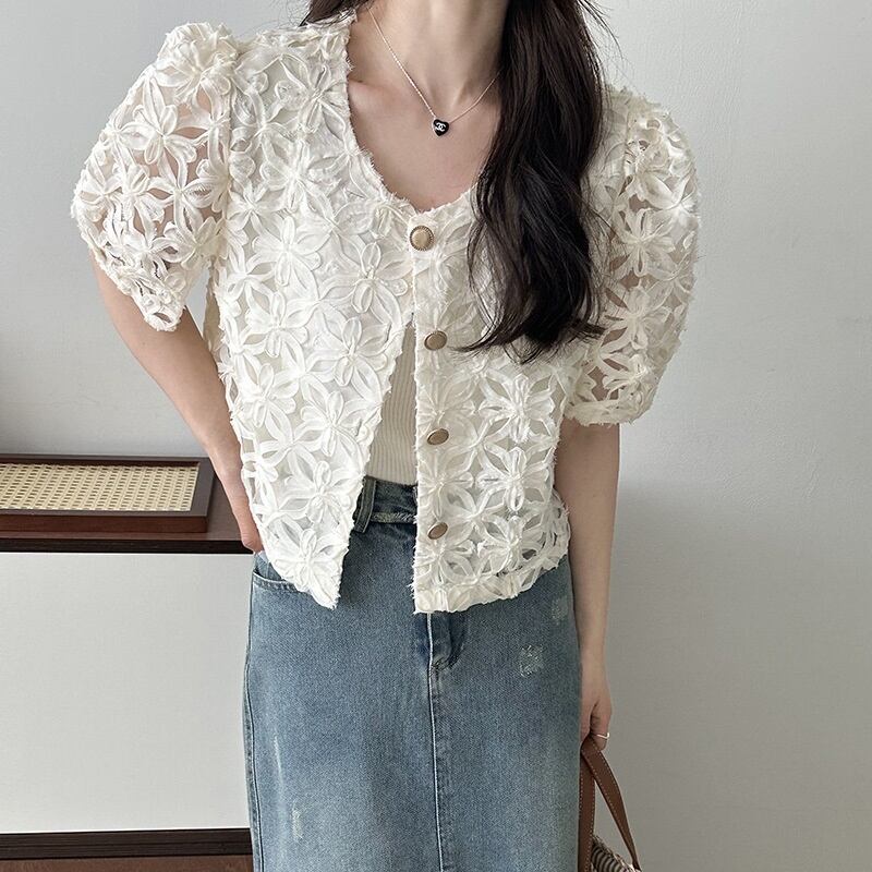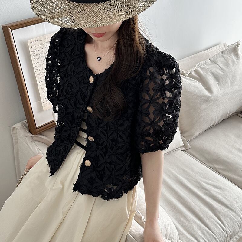 パフスリーブ ショートシャツ 花柄 シースルー エレガント レディース トップス 5分袖 ラウンドネック フェミニン 前開き 透け感 ボタン 透かし模様 透かし編み メッシュ 肌見せ かわいい 大人可愛い きれいめ シンプル カジュアル おしゃれ こなれ感 ガーリー 抜け感 ラブリー キュート 都会的 ベーシック ロマンティック ナチュラル 清潔感 涼しげ リラックス 軽やか 通気性 コンサート ライブ カフェ モノトーン ランチ 韓国 オルチャン 普段使い 着回し モテ 流行 M L ホワイト ブラック