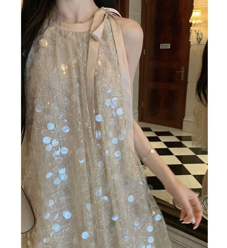 レディース ワンピース ドレス ミニ 膝上 袖なし ノースリーブ 肩出し ホルターネック Aライン 裾ワイド フェミニン レース リボン スパンコール 透かし編み 肌見せ かわいい 大人可愛い おしゃれ こなれ感 ガーリー エレガント 主役級 存在感 キュート プリンセス セクシー 色気 ゴージャス 春 夏 ロングシーズン デート お出かけ パーティー イベント リゾート ショッピング キャバ ラウンジ 韓国 オルチャン 美脚 モテ インスタ映え S M ベージュ ベーシックカラー 大人カラー