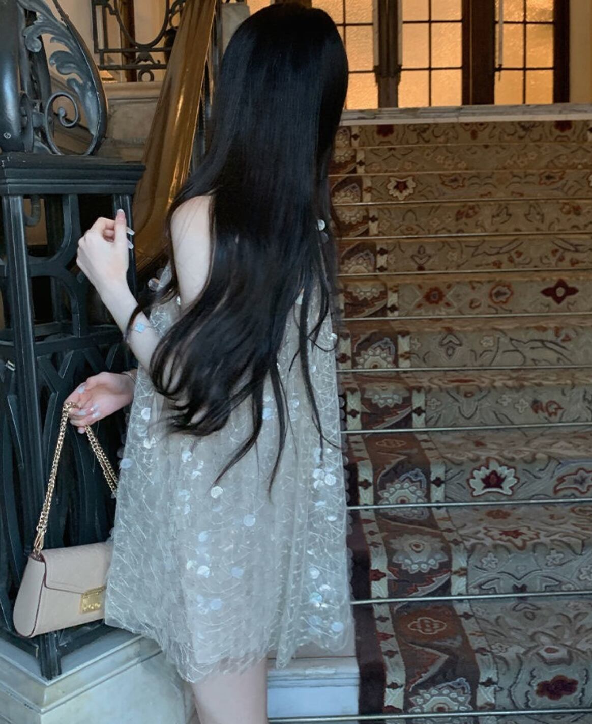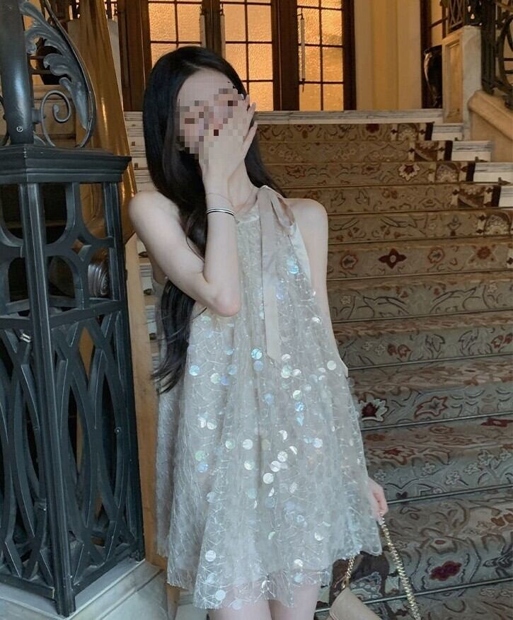 特別な夜を彩る、華やかで洗練されたホルターネックミニドレス。首元は上品なリボン結びのホルターネックデザインで、デコルテから肩のラインを美しく演出。控えめながらもフェミニンな魅力を際立たせます。ふんわりとしたAラインのシルエットは体型を拾いにくく、動きに合わせて軽やかに揺れ、優雅な印象を与えます。歩くたびにきらきらと輝き、周囲の視線を集めること間違いなしの主役級の一着です。