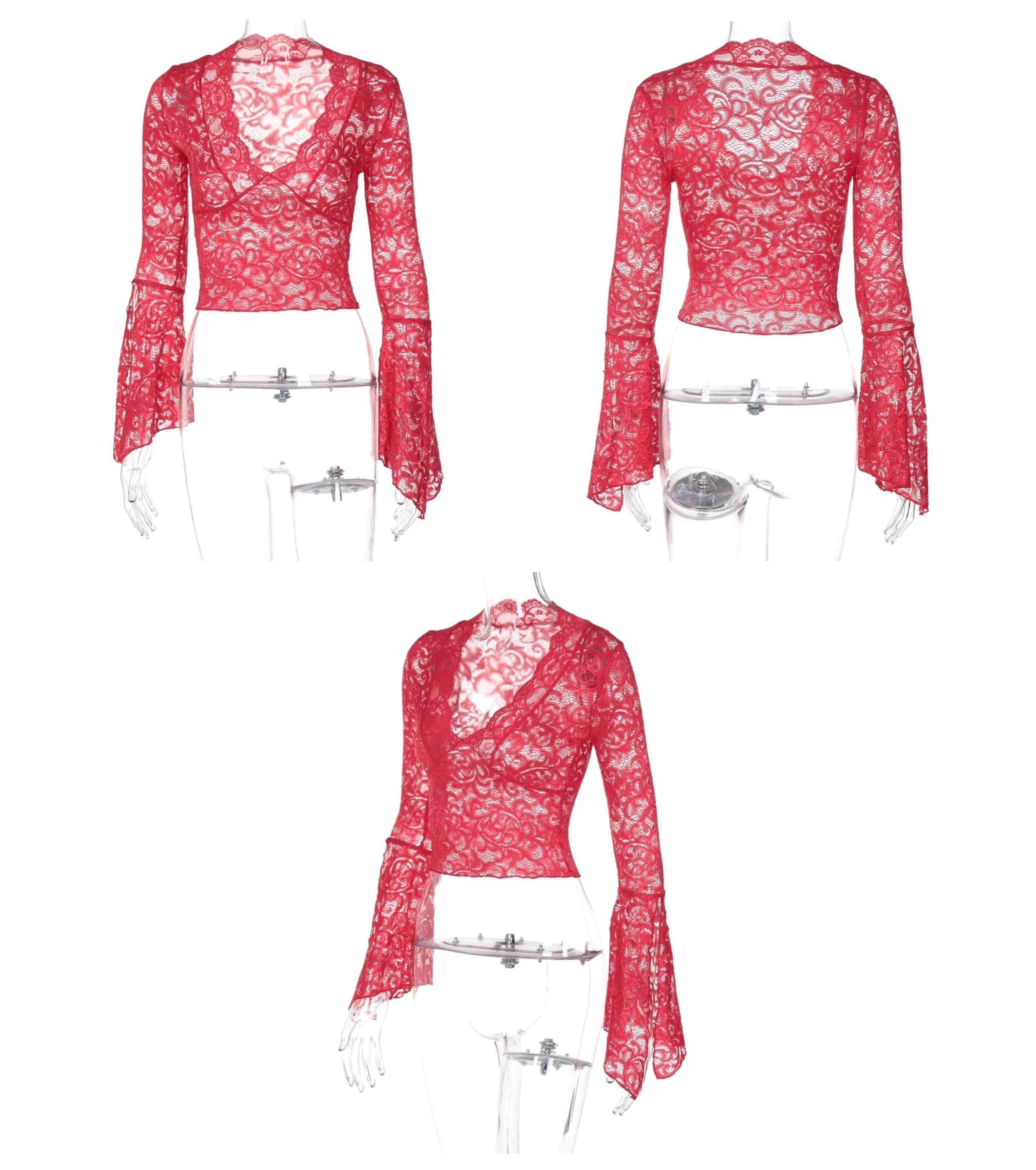レディース トップス ブラウス カットソー ショート クロップド丈 長袖 ベルスリーブ リストフォール Vネック タイト スリム 細身 フェミニン 透け感 シースルー 肌見せ 総レース 薄手 シアー ストレッチ 伸縮性 大人可愛い シンプル カジュアル おしゃれ レトロ エキゾチック エレガント ラブリー キュート アメリカン セクシー 色気 シック Y2K センシュアル 花柄 フラワー 春 夏 秋 お出かけ 旅行 ライブ クラブ トレンド スタイルアップ S M L ホワイト ブラック ピンク レッド
