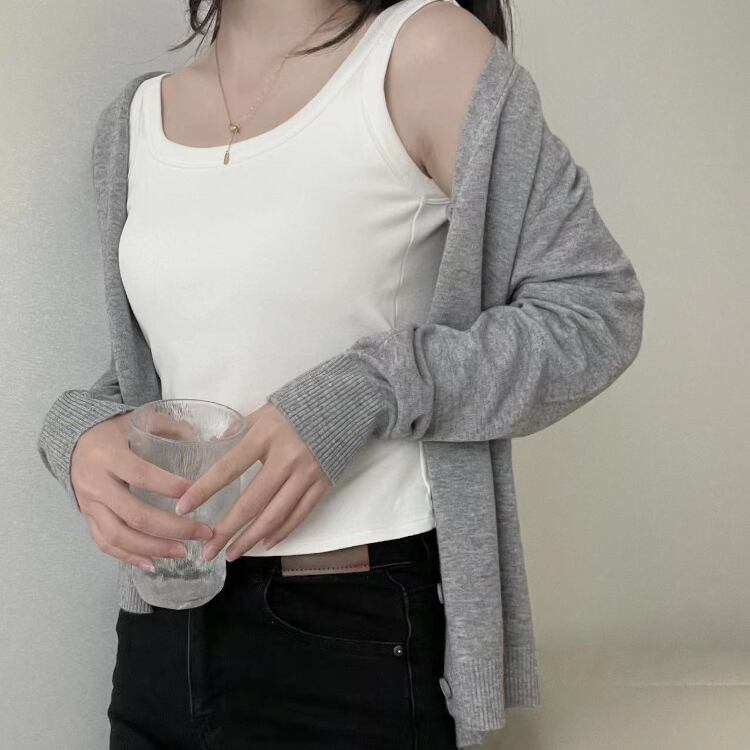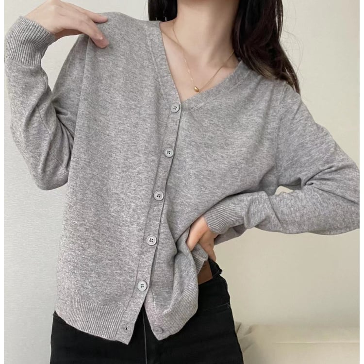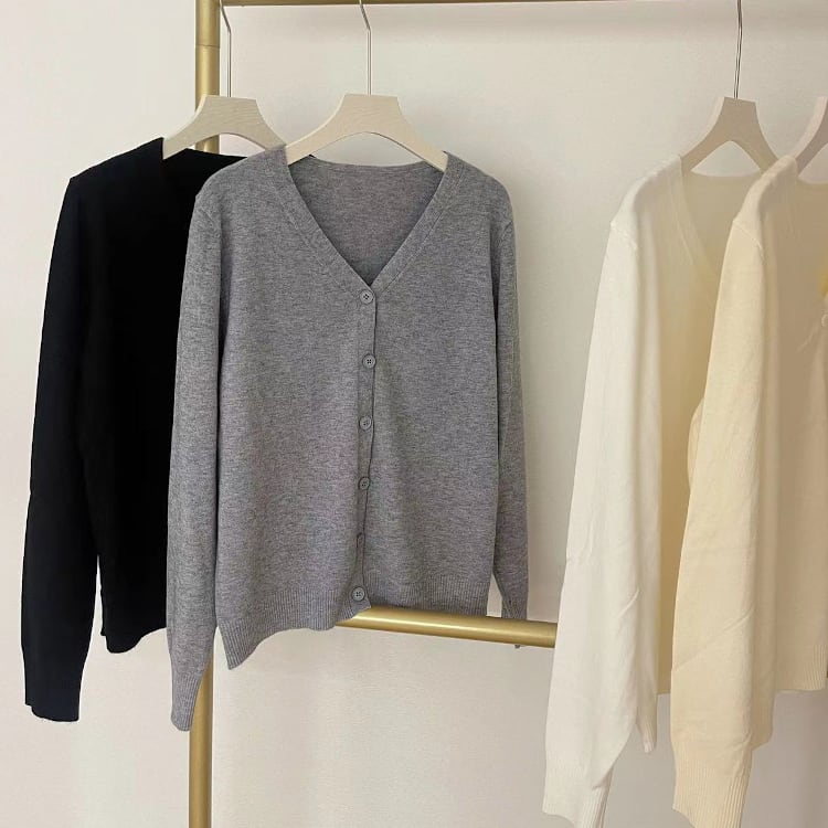シンプルで上品なデザインが魅力のVネックニットカーディガン。