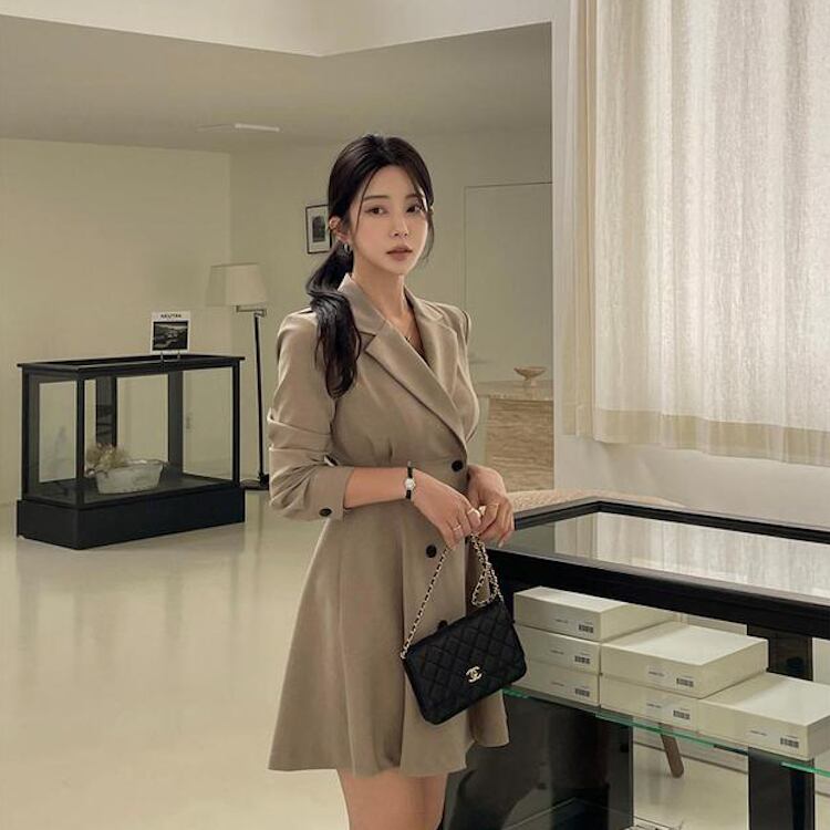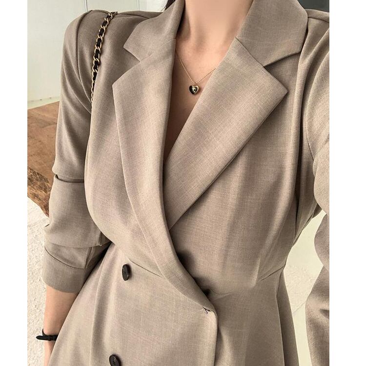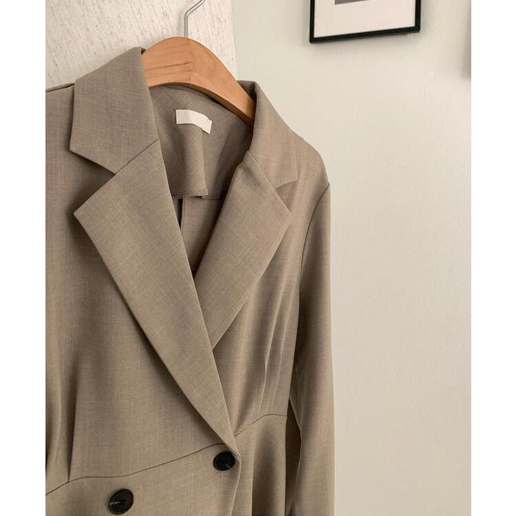 角襟デザインのVネックとダブルブレストボタンが上品さを引き立て、きちんと感のあるフェミニンスタイルを演出します。
