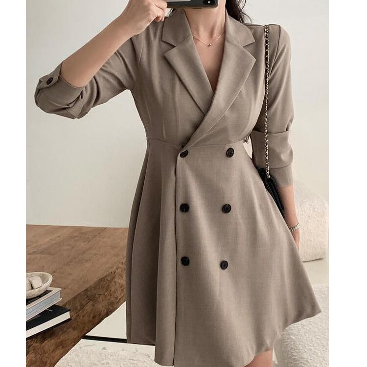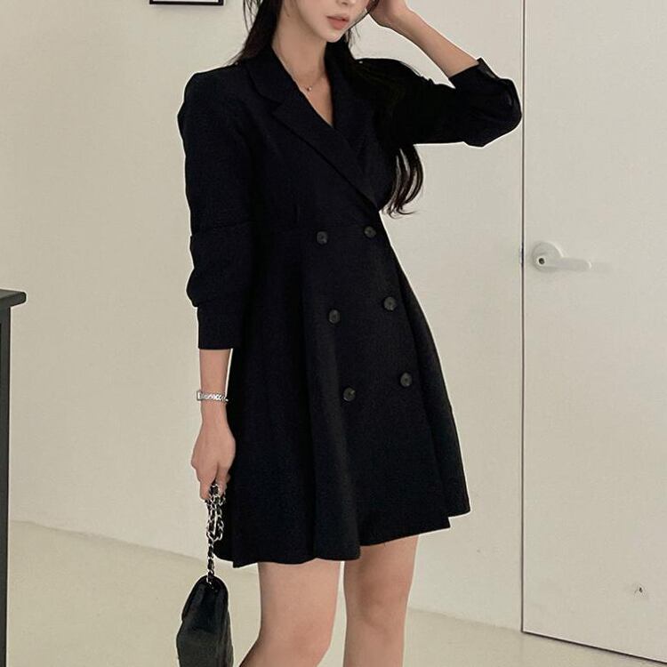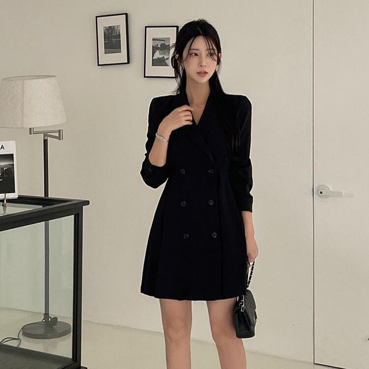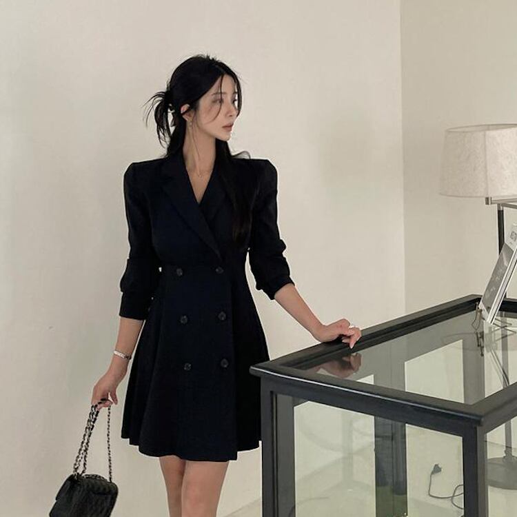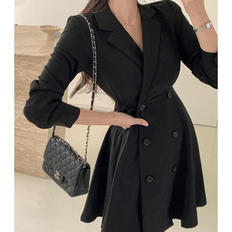 レディース ワンピース ミニ 長袖 Vネック 襟付き 角襟 スリム Aライン フェミニン タックプリーツ ウエストマーク ハイウエスト コンサバ ボタン ダブルブレスト かわいい 大人可愛い きれいめ 上品 おしゃれ こなれ感 存在感 クラシカル ベーシック セクシー 色気 シック 無地 春 秋 デート お出かけ 旅行 女子会 休日 ショッピング コンサート ライブ 合コン コンパ カフェ ランチ 脚長 モテ インスタ映え ワンサイズ 黒 ブラック 茶色 ブラウン ベーシックカラー 大人カラー
