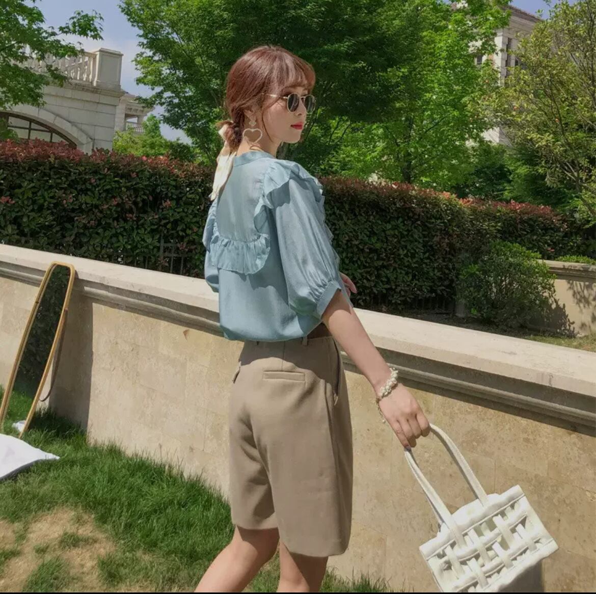 トップス パンツ シャツ ブラウス 2点セット 上下セット レディース ショートパンツ ハーフ 7分袖 フェミニン フリル 前開き 大人可愛い きれいめ シンプル カジュアル 上品 おしゃれ こなれ感 ラフ ルーズ モード系 とろみ感 抜け感 清潔感 リラックス 爽やか 無地 春 夏 オフィス OL 通勤 デート お出かけ イベント 女子会 休日 ショッピング カフェ ランチ 韓国 オルチャン コーデ 楽ちん 普段使い 着回し 清楚 トレンド スタイルアップ S M L XL ライトブルー+ベージュ