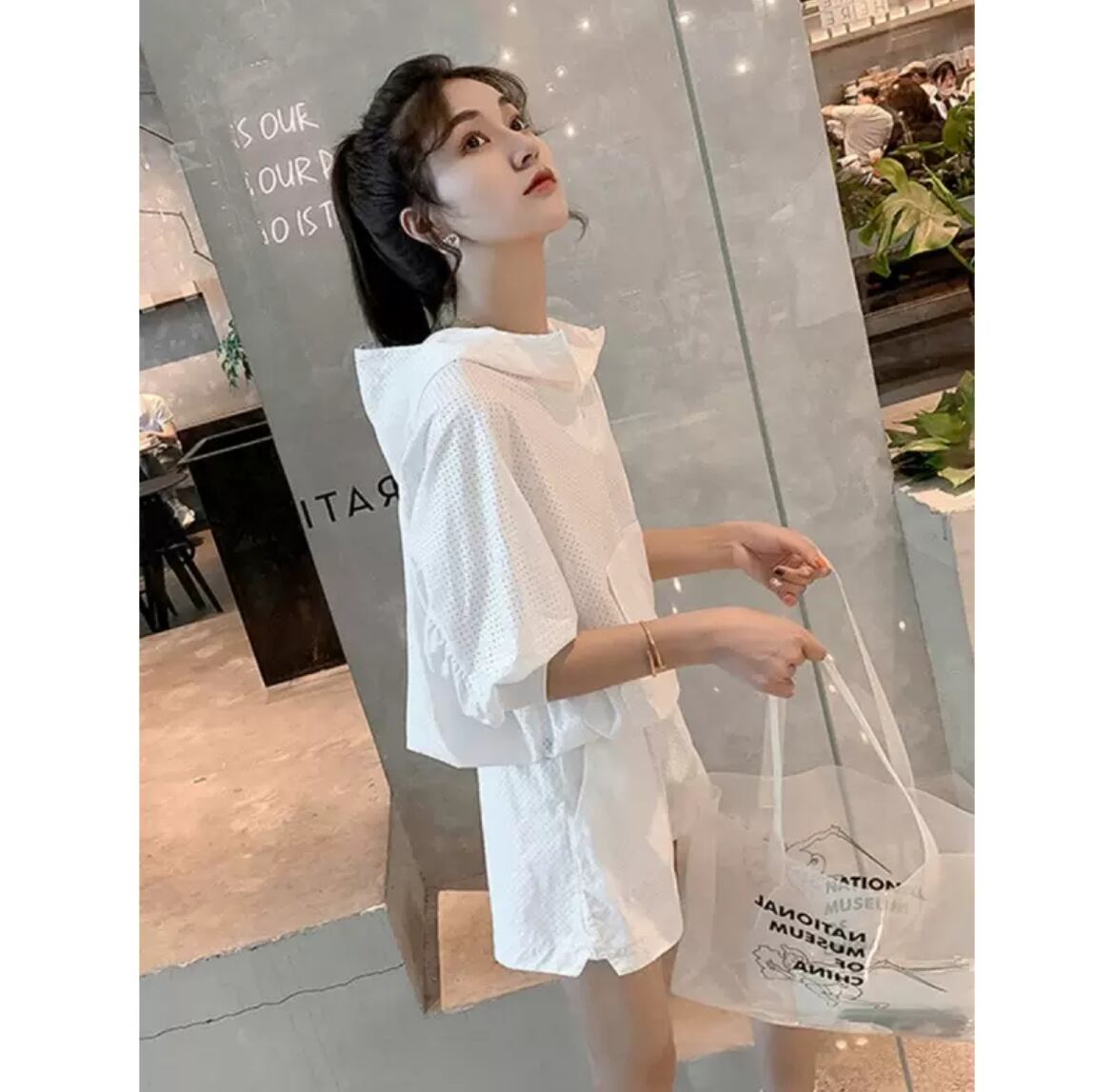 トップス パンツ ボトムス セットアップ 2点セット 上下セット レディース ルームウェア スポーツウェア ショートパンツ 7分袖 フード ストリート メッシュ 透け感 シンプル カジュアル おしゃれ こなれ感 ラフ スポーティー 個性的 とろみ感 抜け感 アクティブ ナチュラル 清潔感 軽やか 無地 春 夏 お出かけ アウトドア イベント プール ジム 公園 ウォーキング 韓国 オルチャン コーデ 楽ちん 普段使い 着回し トレンド スタイルアップ 日焼け予防 M L XL 2XL 3XL ホワイト