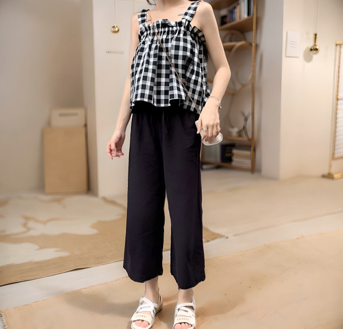 トップス パンツ ボトムス キャミソール セットアップ 2点セット レディース クロップド丈 ノースリーブ ストレート セパレート フェミニン フリル 伸縮性 ギャザー フィット 大人可愛い シンプル カジュアル おしゃれ こなれ感 ラフ ガーリー 存在感 とろみ感 抜け感 アクティブ 涼しげ 軽やか ギンガムチェック 春 夏 デート お出かけ リゾート 女子会 休日 ショッピング カフェ ランチ 韓国 オルチャン 普段使い 着回し トレンド スタイルアップ S M L XL ゆったり ホワイト×ブラック