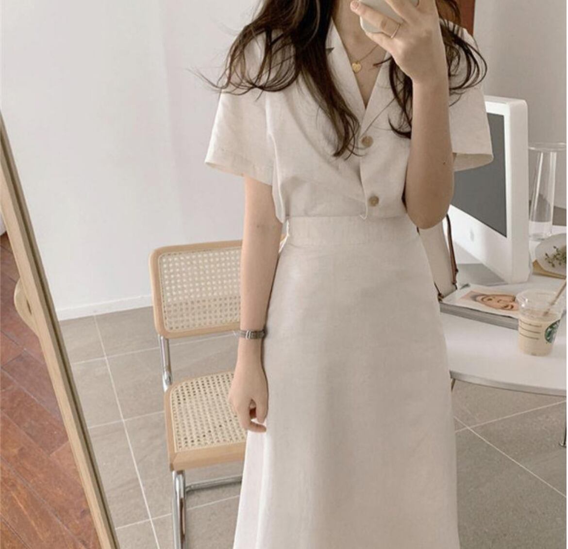 スカート トップス ボトムス シャツ 2点セット 上下セット レディース ロング 半袖 Vネック 襟付き Aライン フェミニン 大人可愛い シンプル カジュアル おしゃれ こなれ感 ラフ モード系 存在感 とろみ感 抜け感 クラシカル アクティブ 清潔感 涼しげ 軽やか ミニマム 無地 春 夏 オフィス OL 通勤 デート お出かけ イベント 女子会 休日 ショッピング カフェ ランチ 韓国 オルチャン コーデ 楽ちん 普段使い 着回し 清楚 トレンド スタイルアップ S M L XL アプリコット